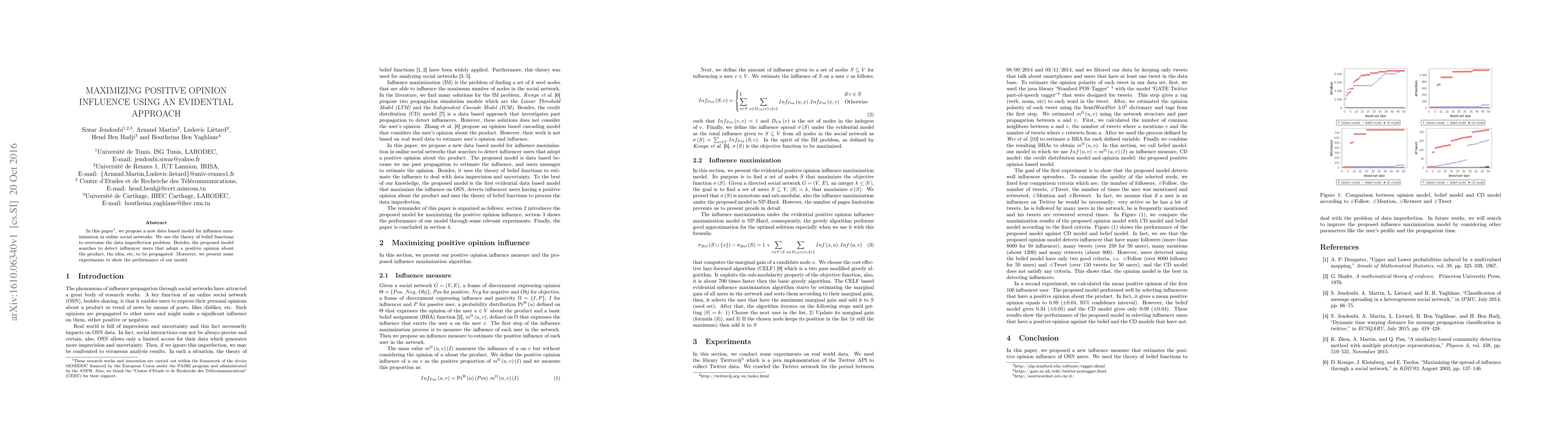 In this paper, we propose a new data based model for influence maximization in online social networks. We use the theory of belief functions to overcome the data imperfection problem. Besides, the proposed model searches to detect influencer users that adopt a positive opinion about the product, the idea, etc, to be propagated. Moreover, we present some experiments to show the performance of our model.