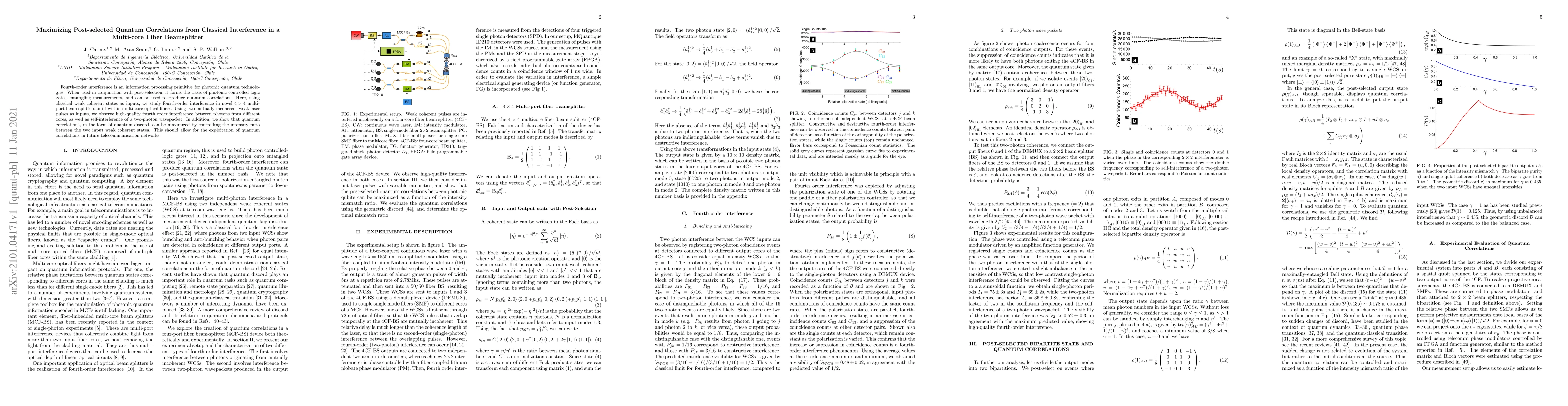 Fourth-order interference is an information processing primitive for photonic quantum technologies. When used in conjunction with post-selection, it forms the basis of photonic controlled logic gates, entangling measurements, and can be used to produce quantum correlations. Here, using classical weak coherent states as inputs, we study fourth-order interference in novel $4 \times 4$ multi-port beam splitters built within multi-core optical fibers. Using two mutually incoherent weak laser pulses as inputs, we observe high-quality fourth order interference between photons from different cores, as well as self-interference of a two-photon wavepacket. In addition, we show that quantum correlations, in the form of quantum discord, can be maximized by controlling the intensity ratio between the two input weak coherent states. This should allow for the exploitation of quantum correlations in future telecommunication networks.