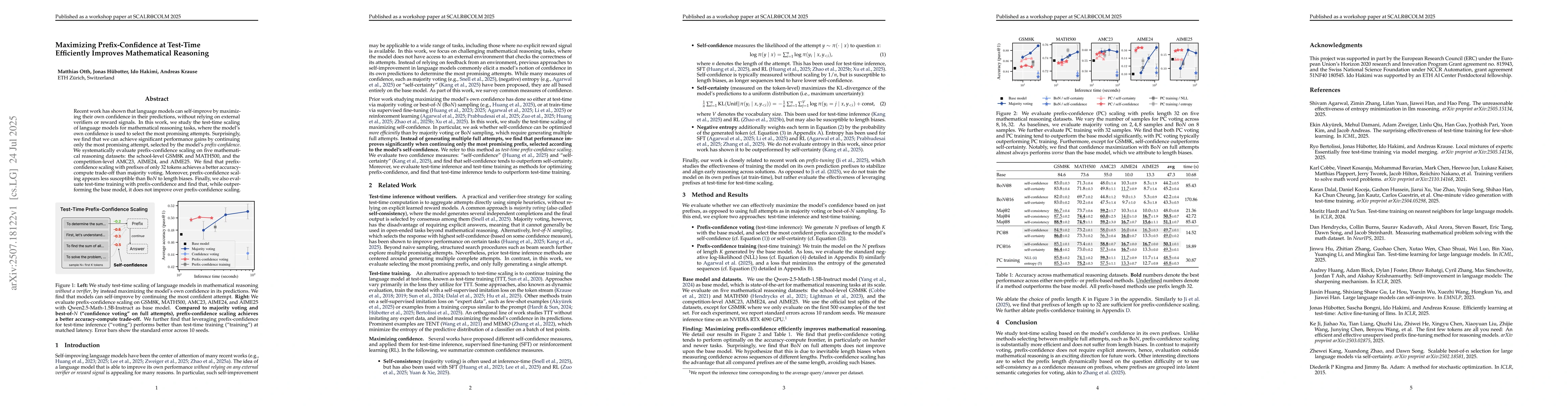 Recent work has shown that language models can self-improve by maximizing their own confidence in their predictions, without relying on external verifiers or reward signals. In this work, we study the test-time scaling of language models for mathematical reasoning tasks, where the model's own confidence is used to select the most promising attempts. Surprisingly, we find that we can achieve significant performance gains by continuing only the most promising attempt, selected by the model's prefix-confidence. We systematically evaluate prefix-confidence scaling on five mathematical reasoning datasets: the school-level GSM8K and MATH500, and the competition-level AMC23, AIME24, and AIME25. We find that prefix-confidence scaling with prefixes of only 32 tokens achieves a better accuracy-compute trade-off than majority voting. Moreover, prefix-confidence scaling appears less susceptible than BoN to length biases. Finally, we also evaluate test-time training with prefix-confidence and find that, while outperforming the base model, it does not improve over prefix-confidence scaling.
