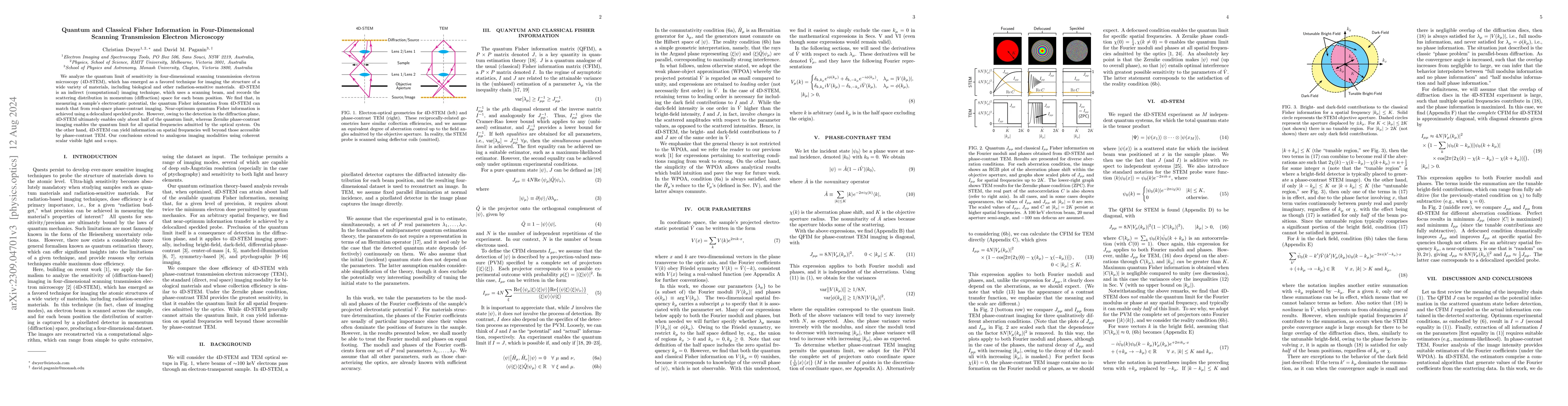 We analyze the transfer of quantum information to detected classical information in four-dimensional scanning transmission electron microscopy. In estimating the moduli and phases of the Fourier coefficients of the sample's electrostatic potential, we find that near-optimum information transfer is achieved by a delocalized speckled probe, which attains about half of the available quantum Fisher information. The quantum limit itself is precluded due to detecting the scattering in momentum space. We compare with direct phase-contrast imaging, where a Zernike phase condition attains the quantum limit for all spatial frequencies admitted by the optical system. Our conclusions also apply to other forms of coherent scalar radiation, such as visible light and x-rays.