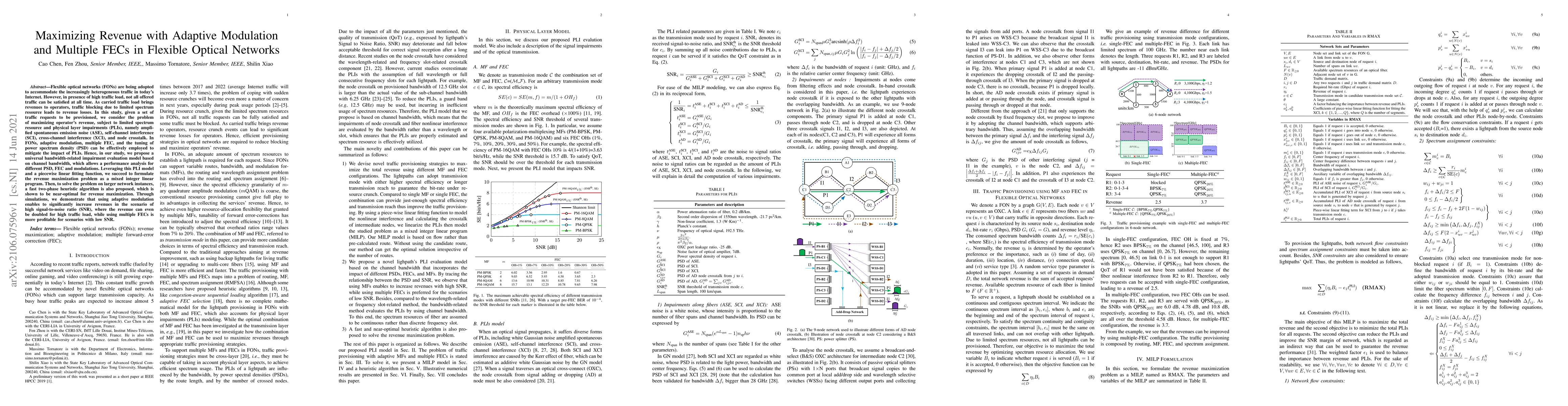 This paper proposes a revenue maximization strategy for flexible optical networks using adaptive modulation and multiple forward error correction (FEC) techniques, addressing the challenge of traffic blocking due to limited spectrum resources and physical layer impairments. The study formulates the problem as a mixed integer linear program and introduces a heuristic algorithm for efficient solution, demonstrating significant revenue gains through adaptive modulation in high SNR scenarios and multiple FECs in low SNR scenarios.