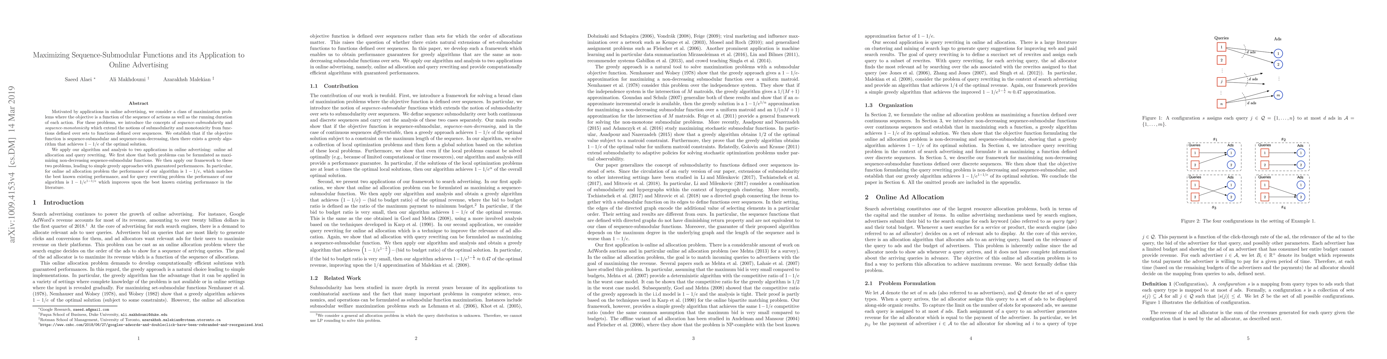 The paper introduces sequence-submodularity and sequence-monotonicity for optimizing sequence-dependent functions, applicable to online advertising. A greedy algorithm achieving a $1-1/e$ approximation is presented, applied to ad allocation and query rewriting problems, outperforming existing methods in both cases.