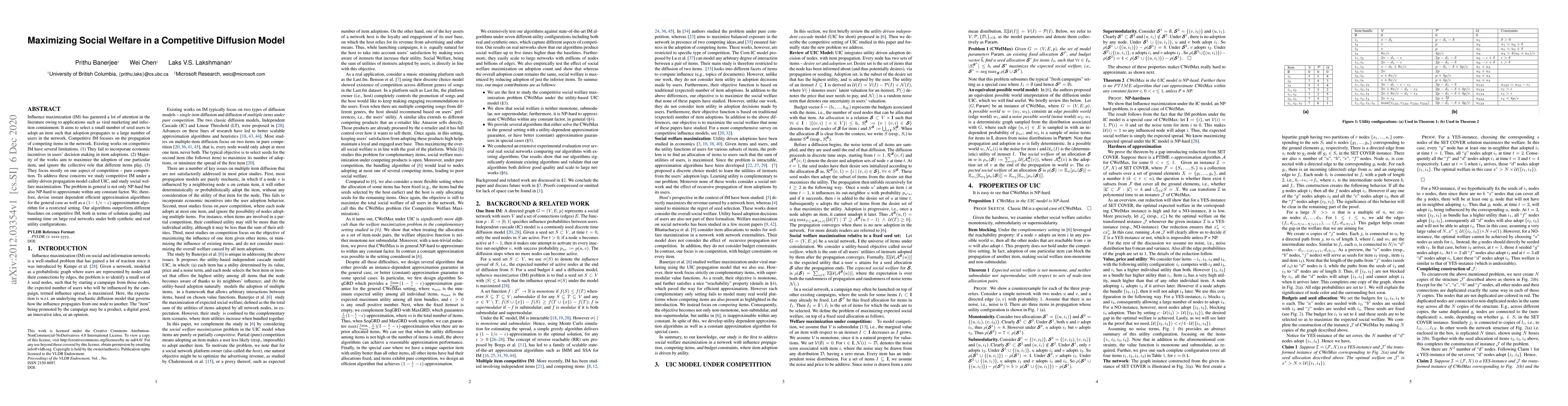 Influence maximization (IM) has garnered a lot of attention in the literature owing to applications such as viral marketing and infection containment. It aims to select a small number of seed users to adopt an item such that adoption propagates to a large number of users in the network. Competitive IM focuses on the propagation of competing items in the network. Existing works on competitive IM have several limitations. (1) They fail to incorporate economic incentives in users' decision making in item adoptions. (2) Majority of the works aim to maximize the adoption of one particular item, and ignore the collective role that different items play. (3) They focus mostly on one aspect of competition -- pure competition. To address these concerns we study competitive IM under a utility-driven propagation model called UIC, and study social welfare maximization. The problem in general is not only NP-hard but also NP-hard to approximate within any constant factor. We, therefore, devise instant dependent efficient approximation algorithms for the general case as well as a $(1-1/e-\epsilon)$-approximation algorithm for a restricted setting. Our algorithms outperform different baselines on competitive IM, both in terms of solution quality and running time on large real networks under both synthetic and real utility configurations.