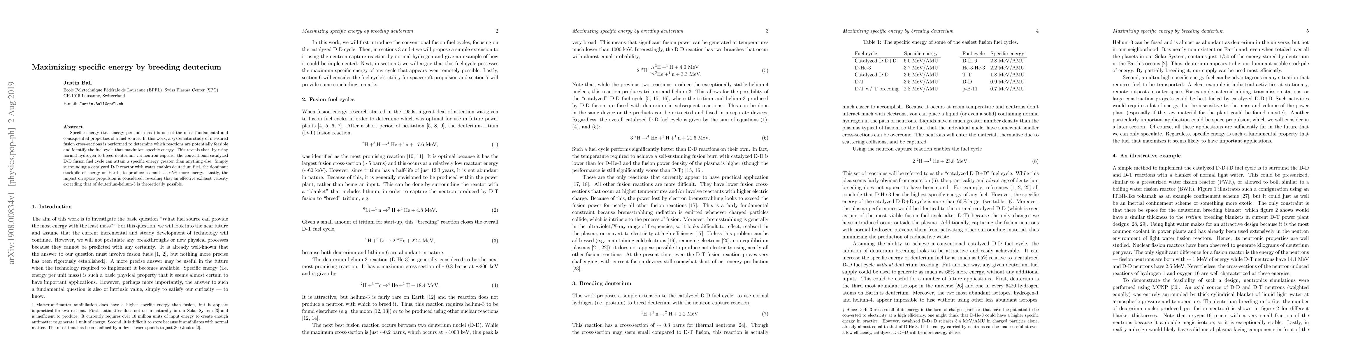 Specific energy (i.e. energy per unit mass) is one of the most fundamental and consequential properties of a fuel source. In this work, a systematic study of measured fusion cross-sections is performed to determine which reactions are potentially feasible and identify the fuel cycle that maximizes specific energy. This reveals that, by using normal hydrogen to breed deuterium via neutron capture, the conventional catalyzed D-D fusion fuel cycle can attain a specific energy greater than anything else. Simply surrounding a catalyzed D-D reactor with water enables deuterium fuel, the dominant stockpile of energy on Earth, to produce as much as 65% more energy. Lastly, the impact on space propulsion is considered, revealing that an effective exhaust velocity exceeding that of deuterium-helium-3 is theoretically possible.