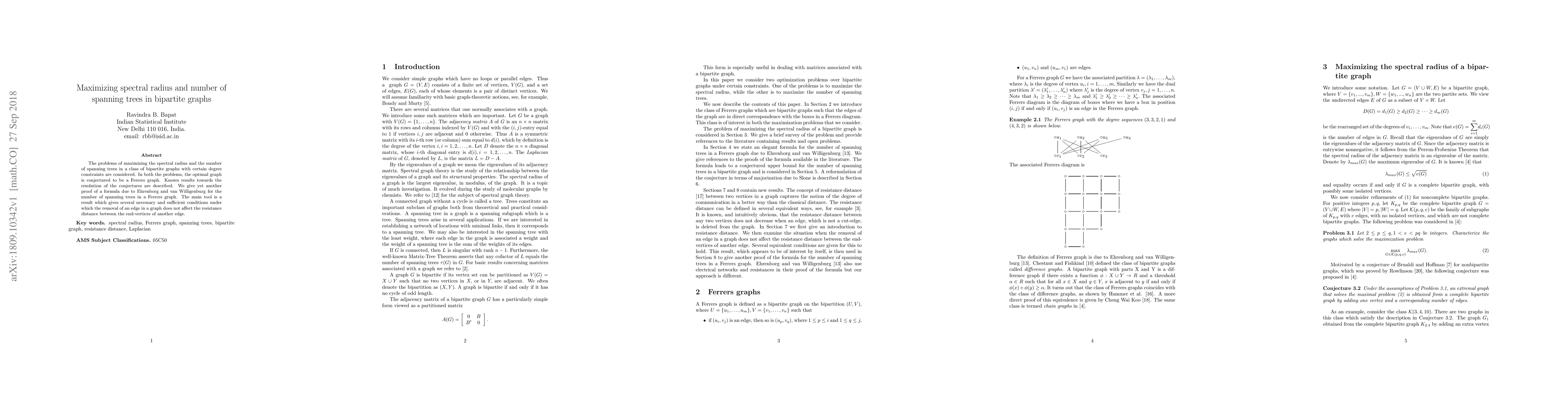 The problems of maximizing the spectral radius and the number of spanning trees in a class of bipartite graphs with certain degree constraints are considered. In both the problems, the optimal graph is conjectured to be a Ferrers graph. Known results towards the resolution of the conjectures are described. We give yet another proof of a formula due to Ehrenborg and van Willigenburg for the number of spanning trees in a Ferrers graph. The main tool is a result which gives several necessary and sufficient conditions under which the removal of an edge in a graph does not affect the resistance distance between the end-vertices of another edge.