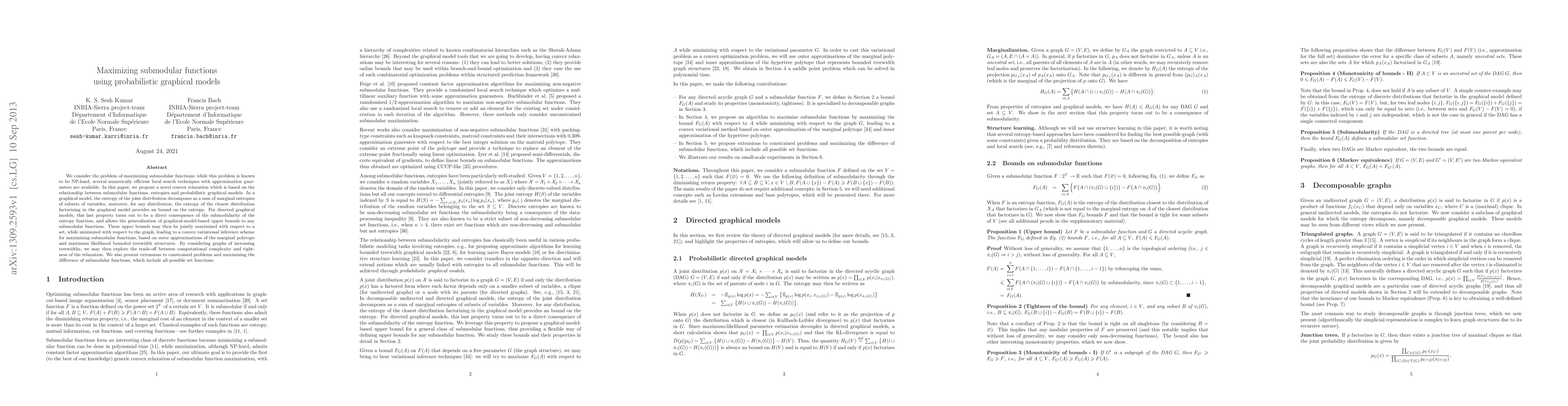 This paper proposes a novel convex relaxation method for maximizing submodular functions, leveraging the relationship between submodular functions, entropies, and probabilistic graphical models. It introduces a convex variational inference scheme based on the decomposition of entropy in graphical models and explores trade-offs between computational complexity and relaxation tightness through varying treewidths.