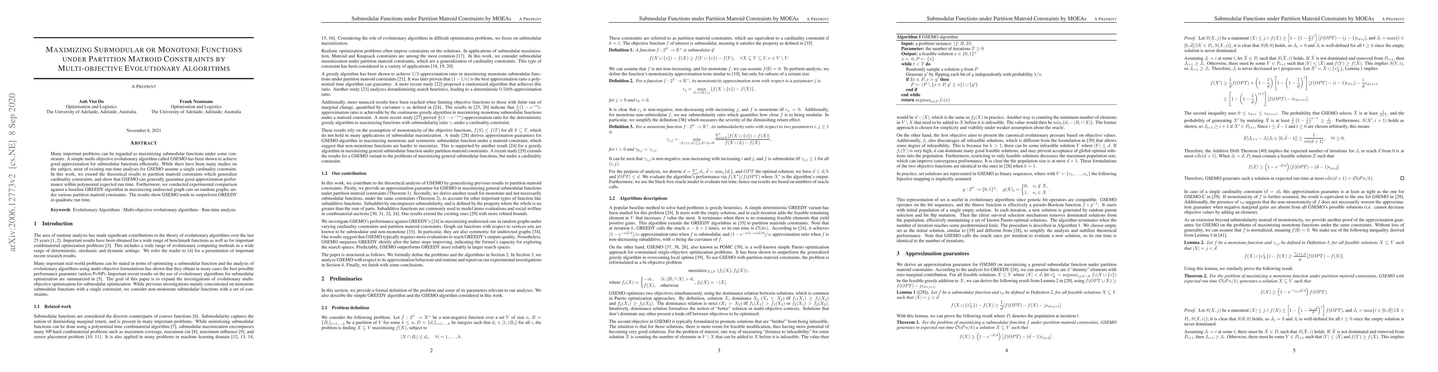 This paper extends the theoretical analysis of the GSEMO algorithm to partition matroid constraints, showing it maintains good approximation performance under these constraints within polynomial expected run time. Experimental results demonstrate GSEMO outperforms the GREEDY algorithm in maximizing undirected graph cuts on random graphs under various partition matroid constraints, especially in quadratic run time.