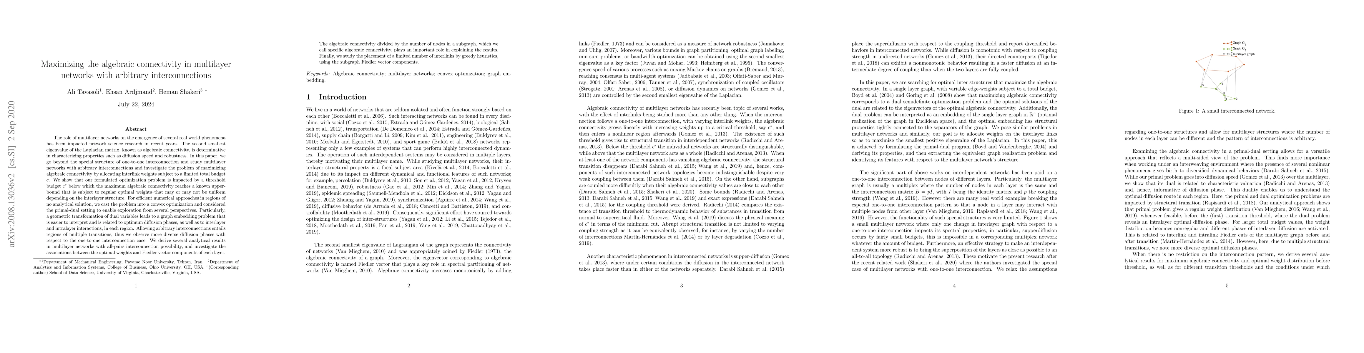 This paper explores maximizing algebraic connectivity in multilayer networks by optimizing interlink weights under budget constraints, identifying an upper-bound for connectivity under certain conditions and transforming the problem into a convex framework for efficient numerical solutions. Analytical results and heuristics are provided for diverse diffusion phases and optimal weight placement.