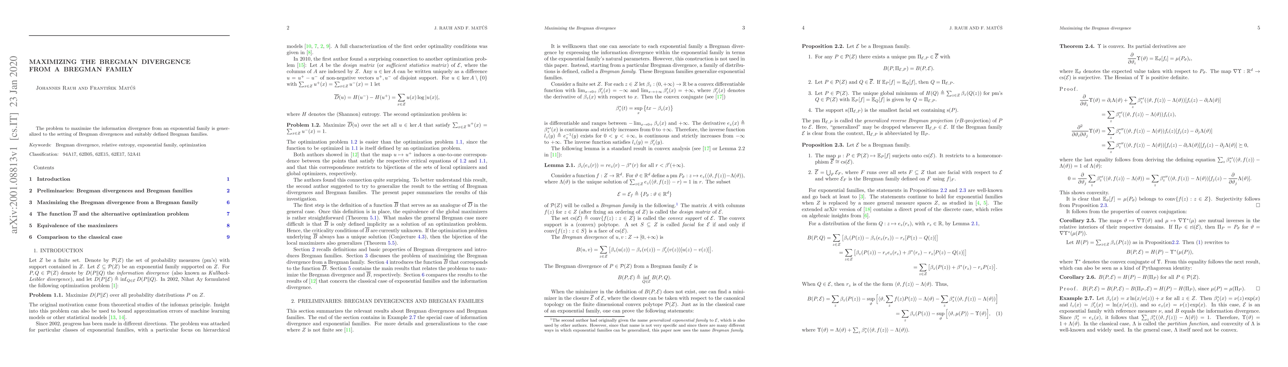 Summary: This paper generalizes the problem of maximizing information divergence to Bregman divergences, introducing a framework for optimizing divergences from Bregman families, which extends the exponential family concept.