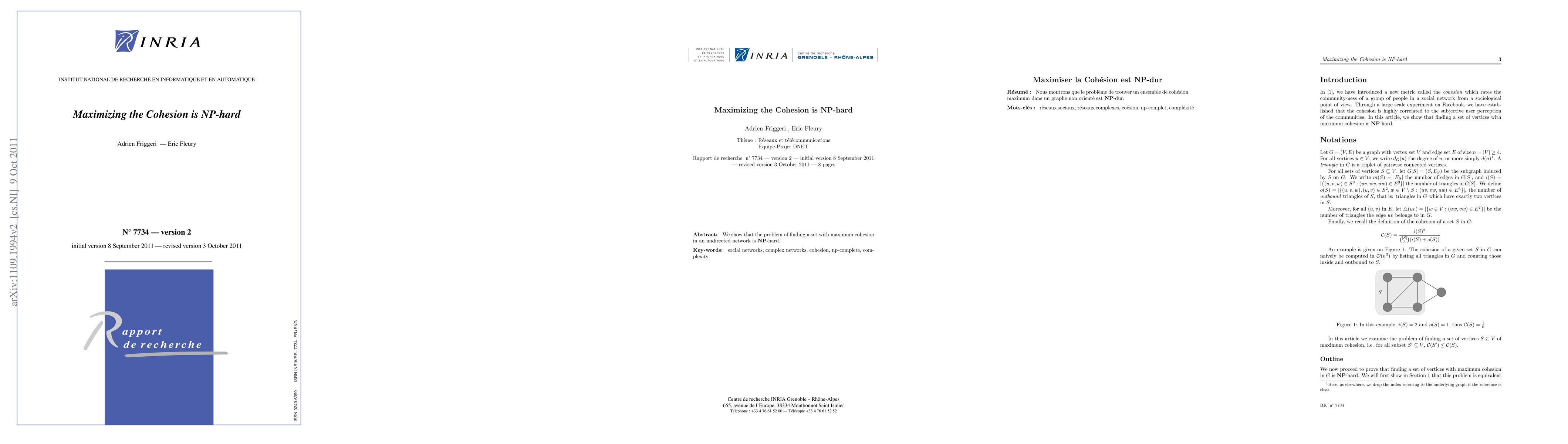 We show that the problem of finding a set with maximum cohesion in an undirected network is NP-hard.