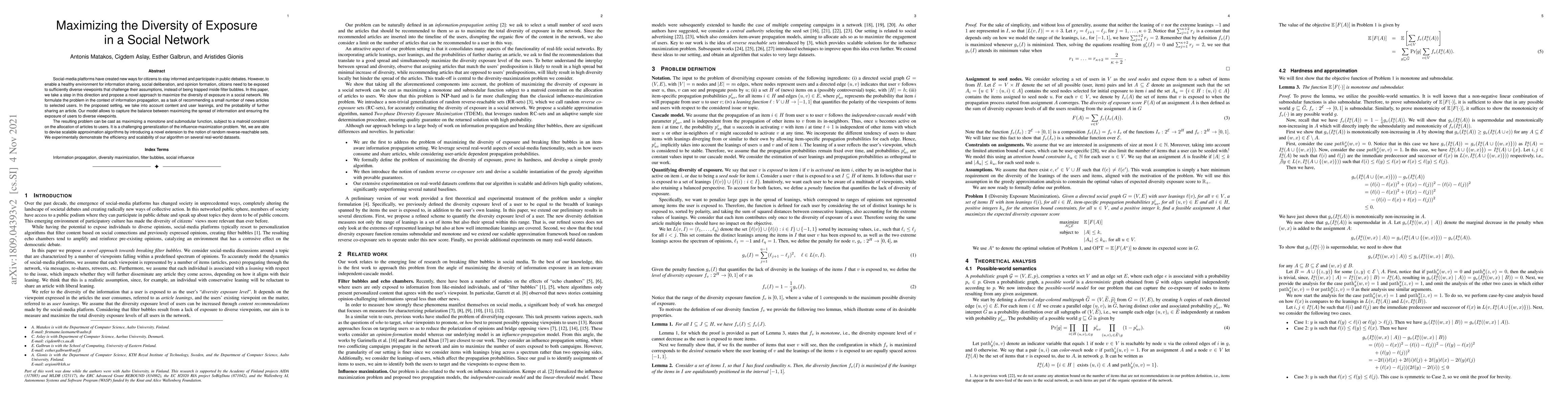 A new algorithm is proposed to maximize diversity of exposure in social networks by recommending diverse news articles to users while considering content and user leanings.
