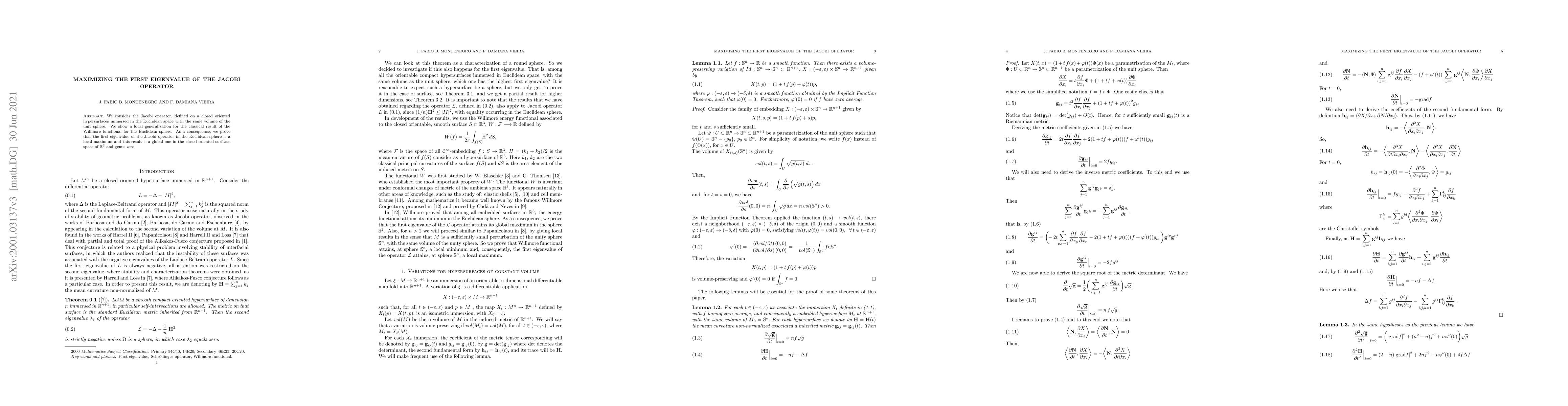We consider the Jacobi operator, defined on a closed oriented hypersurfaces immersed in the Euclidean space with the same volume of the unit sphere. We show a local generalization for the classical result of the Willmore functional for the Euclidean sphere. As a consequence, we prove that the first eigenvalue of the Jacobi operator in the Euclidean sphere is a local maximum and this result is a global one in the closed oriented surfaces space of $\mathbb{R}^3$ and genus zero.