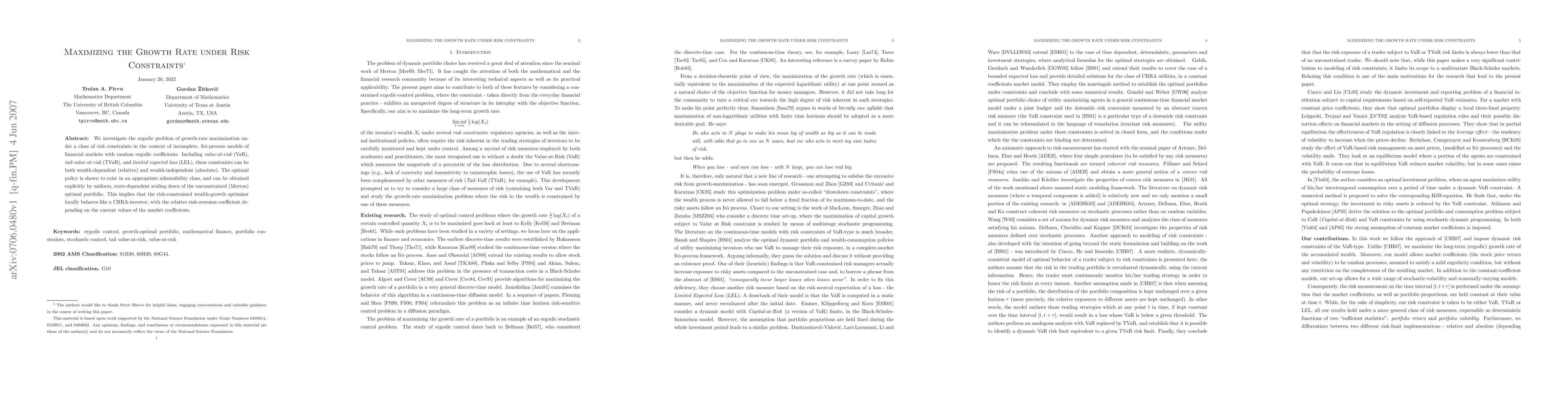 Researchers found that optimizing investment growth under risk constraints can be achieved using a similar approach to risk-averse investors, with the level of risk aversion depending on market conditions.