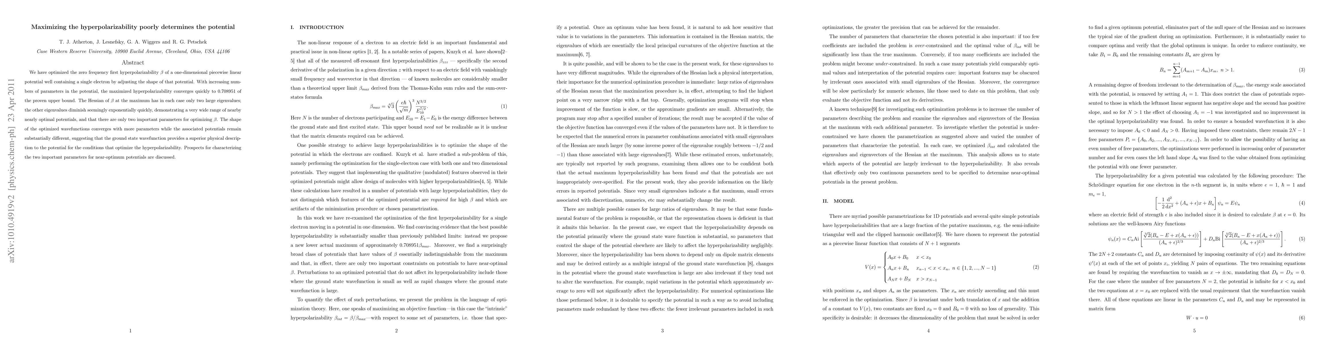We have optimized the zero frequency first hyperpolarizability \beta of a one-dimensional piecewise linear potential well containing a single electron by adjusting the shape of that potential. With increasing numbers of parameters in the potential, the maximized hyperpolarizability converges quickly to 0.708951 of the proven upper bound. The Hessian of \beta at the maximum has in each case only two large eigenvalues; the other eigenvalues diminish seemingly exponentially quickly, demonstrating a very wide range of nearby nearly optimal potentials, and that there are only two important parameters for optimizing \beta. The shape of the optimized wavefunctions converges with more parameters while the associated potentials remain substantially different, suggesting that the ground state wavefunction provides a superior physical description to the potential for the conditions that optimize the hyperpolarizability. Prospects for characterizing the two important parameters for near-optimum potentials are discussed.