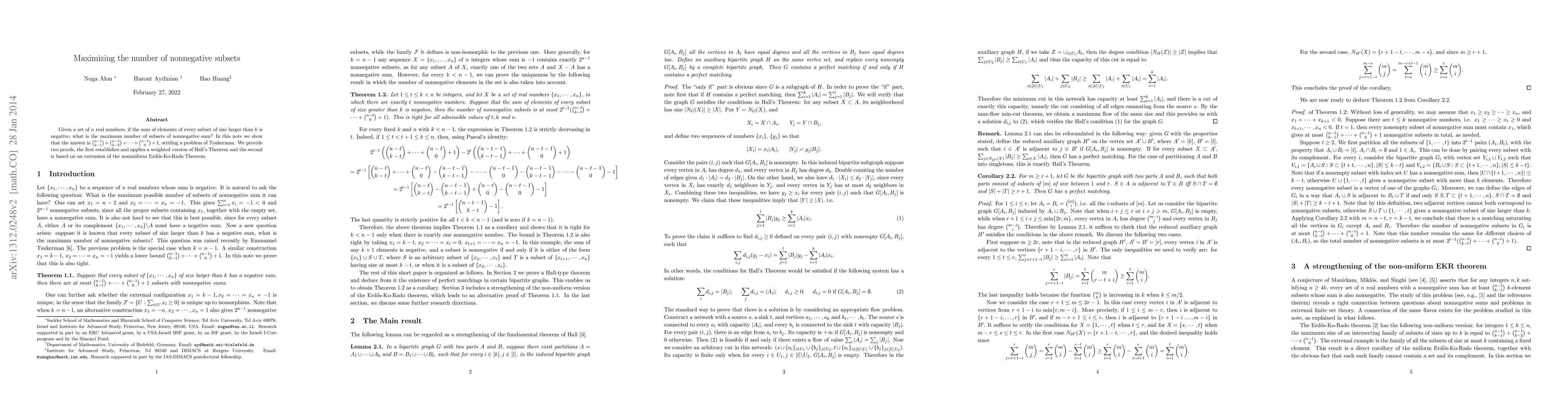 Given a set of $n$ real numbers, if the sum of elements of every subset of size larger than $k$ is negative, what is the maximum number of subsets of nonnegative sum? In this note we show that the answer is $\binom{n-1}{k-1} + \binom{n-1}{k-2} + \cdots + \binom{n-1}{0}+1$, settling a problem of Tsukerman. We provide two proofs, the first establishes and applies a weighted version of Hall's Theorem and the second is based on an extension of the nonuniform Erd\H{o}s-Ko-Rado Theorem.