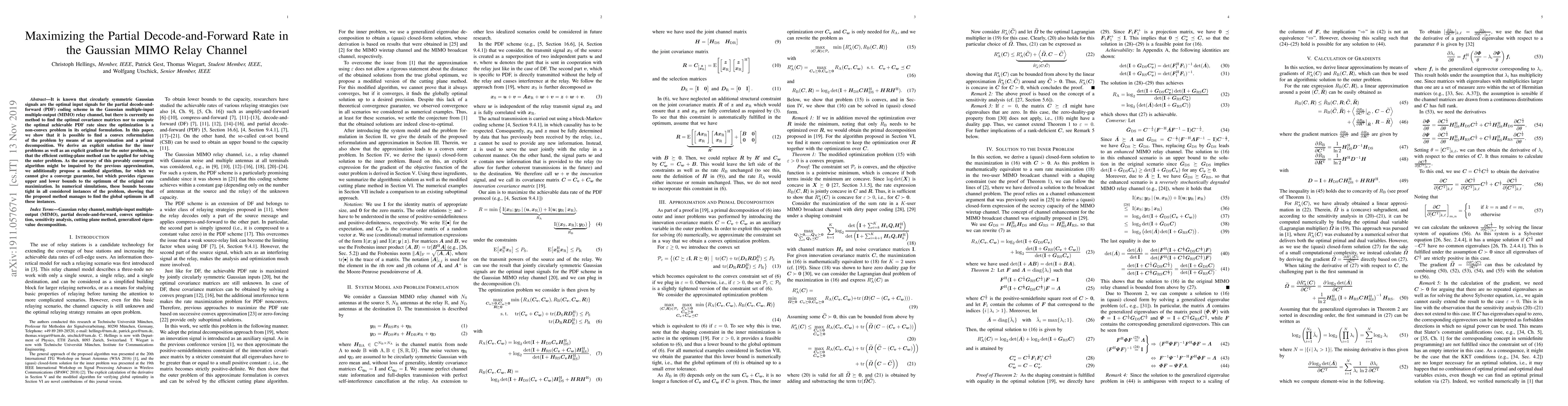 It is known that circularly symmetric Gaussian signals are the optimal input signals for the partial decode-and-forward (PDF) coding scheme in the Gaussian multiple-input multiple-output (MIMO) relay channel, but there is currently no method to find the optimal covariance matrices nor to compute the optimal achievable PDF rate since the optimization is a non-convex problem in its original formulation. In this paper, we show that it is possible to find a convex reformulation of the problem by means of an approximation and a primal decomposition. We derive an explicit solution for the inner problems as well as an explicit gradient for the outer problem, so that the efficient cutting-plane method can be applied for solving the outer problem. As the accuracy of this provably convergent algorithm might be impaired by the previous approximation, we additionally propose a modified algorithm, for which we cannot give a converge guarantee, but which provides rigorous upper and lower bounds to the optimum of the original rate maximization. In numerical simulations, these bounds become tight in all considered instances of the problem, showing that the proposed method manages to find the global optimum in all these instances.
