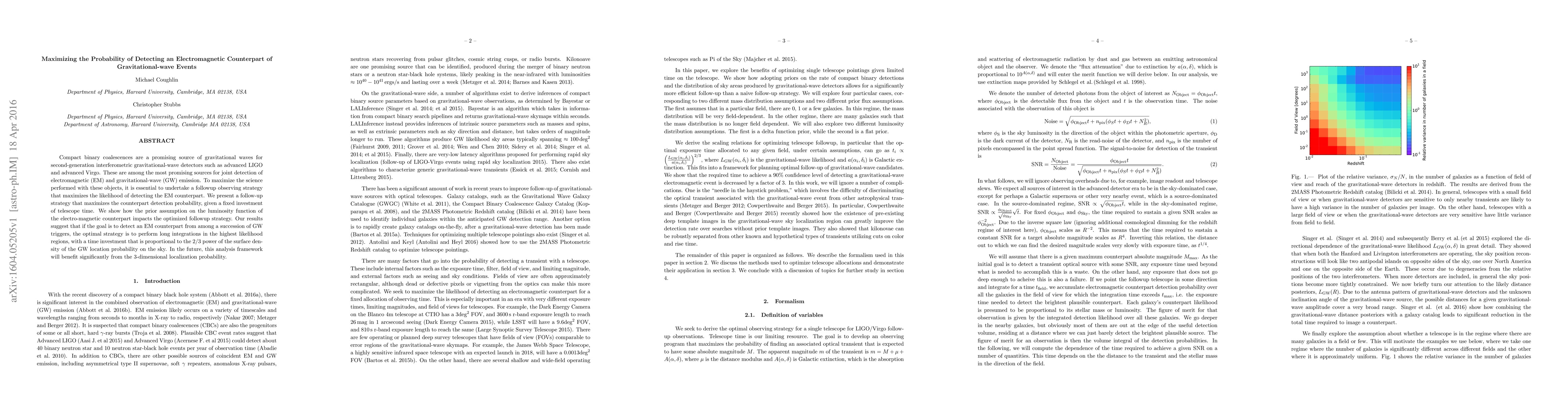 This paper proposes an optimized follow-up strategy to maximize the detection of electromagnetic counterparts from gravitational-wave events, emphasizing the importance of telescope time allocation. The strategy suggests long integrations in high-probability regions, proportional to the $2/3$ power of the gravitational-wave location probability, and highlights the impact of the luminosity function assumptions on the approach.