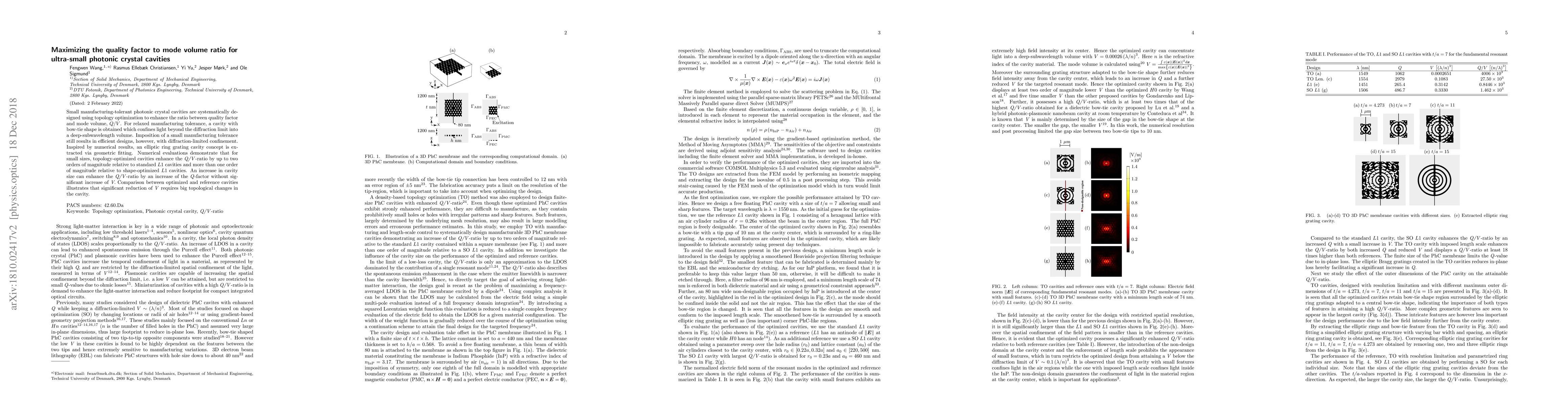 Small manufacturing-tolerant photonic crystal cavities are systematically designed using topology optimization to enhance the ratio between quality factor and mode volume, Q/V. For relaxed manufacturing tolerance, a cavity with bow-tie shape is obtained which confines light beyond the diffraction limit into a deep-subwavelength volume. Imposition of a small manufacturing tolerance still results in efficient designs, however, with diffraction-limited confinement. Inspired by numerical results, an elliptic ring grating cavity concept is extracted via geometric fitting. Numerical evaluations demonstrate that for small sizes, topology-optimized cavities enhance the Q/V-ratio by up to two orders of magnitude relative to standard L1 cavities and more than one order of magnitude relative to shape-optimized L1 cavities. An increase in cavity size can enhance the Q/V-ratio by an increase of the Q-factor without significant increase of V. Comparison between optimized and reference cavities illustrates that significant reduction of V requires big topological changes in the cavity.