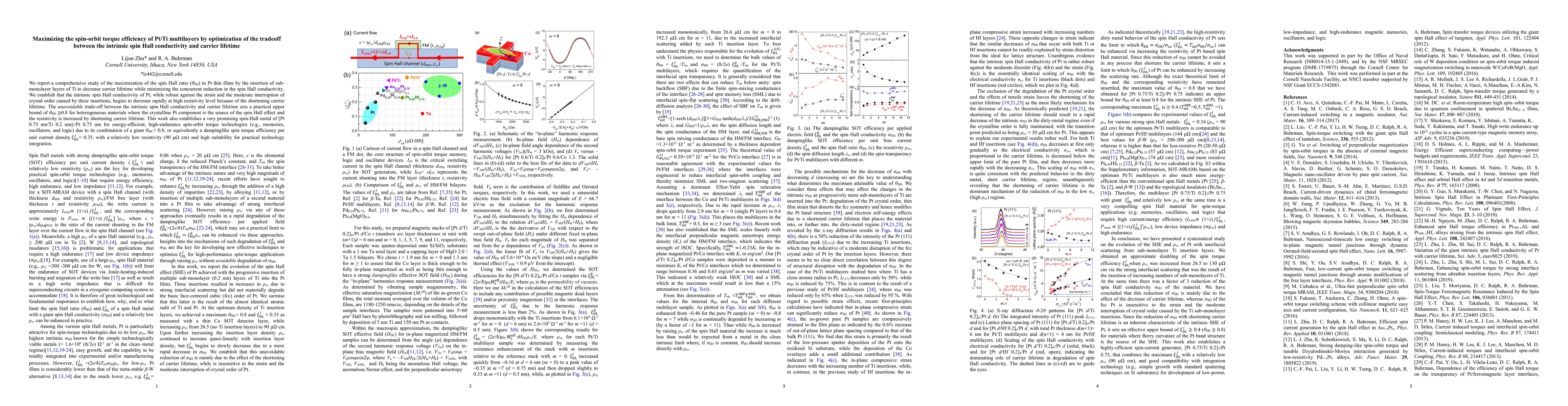 This study optimizes Pt/Ti multilayers to maximize spin-orbit torque efficiency by balancing spin Hall conductivity and carrier lifetime. The insertion of sub-monolayer Ti layers enhances the spin Hall ratio while maintaining conductivity, establishing a practical upper bound of 0.8 for spin Hall ratio in such materials.