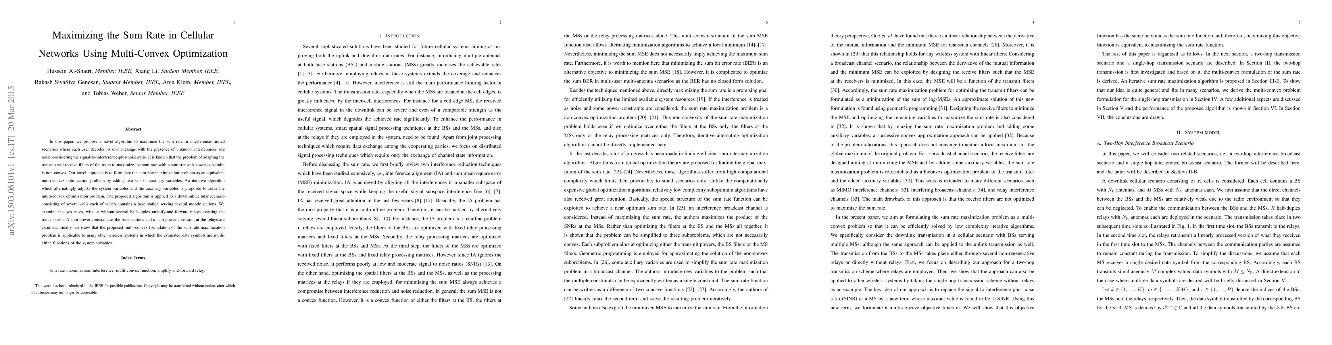 In this paper, we propose a novel algorithm to maximize the sum rate in interference-limited scenarios where each user decodes its own message with the presence of unknown interferences and noise considering the signal-to-interference-plus-noise-ratio. It is known that the problem of adapting the transmit and receive filters of the users to maximize the sum rate with a sum transmit power constraint is non-convex. Our novel approach is to formulate the sum rate maximization problem as an equivalent multi-convex optimization problem by adding two sets of auxiliary variables. An iterative algorithm which alternatingly adjusts the system variables and the auxiliary variables is proposed to solve the multi-convex optimization problem. The proposed algorithm is applied to a downlink cellular scenario consisting of several cells each of which contains a base station serving several mobile stations. We examine the two cases, with or without several half-duplex amplify-and-forward relays assisting the transmission. A sum power constraint at the base stations and a sum power constraint at the relays are assumed. Finally, we show that the proposed multi-convex formulation of the sum rate maximization problem is applicable to many other wireless systems in which the estimated data symbols are multi-affine functions of the system variables.