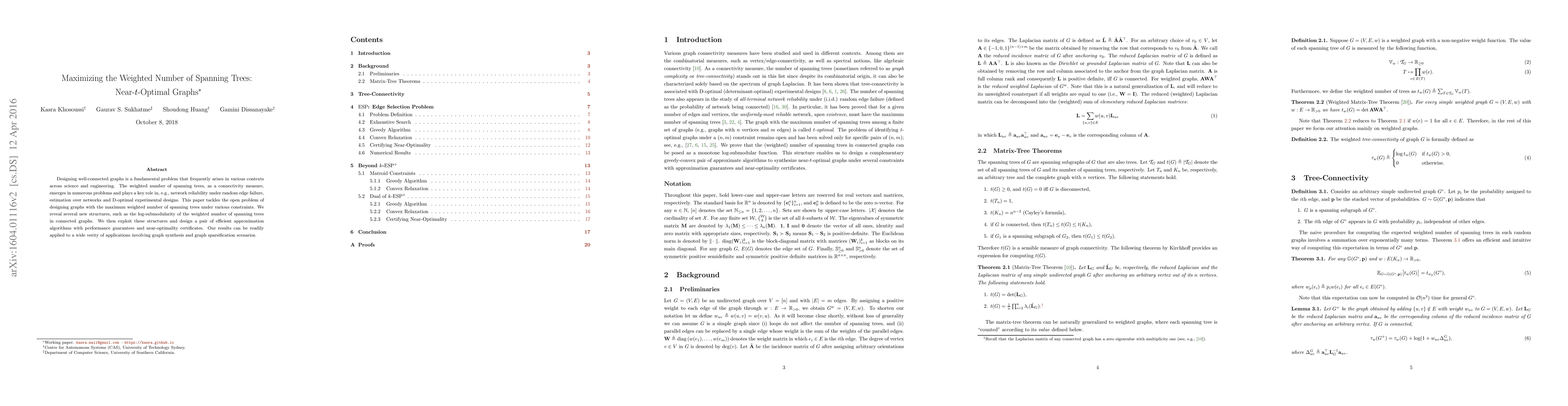 This paper addresses the challenge of designing graphs with the maximum weighted number of spanning trees, a key measure of connectivity. It introduces novel structures and develops efficient algorithms with performance guarantees, applicable to network reliability, estimation, and experimental design.