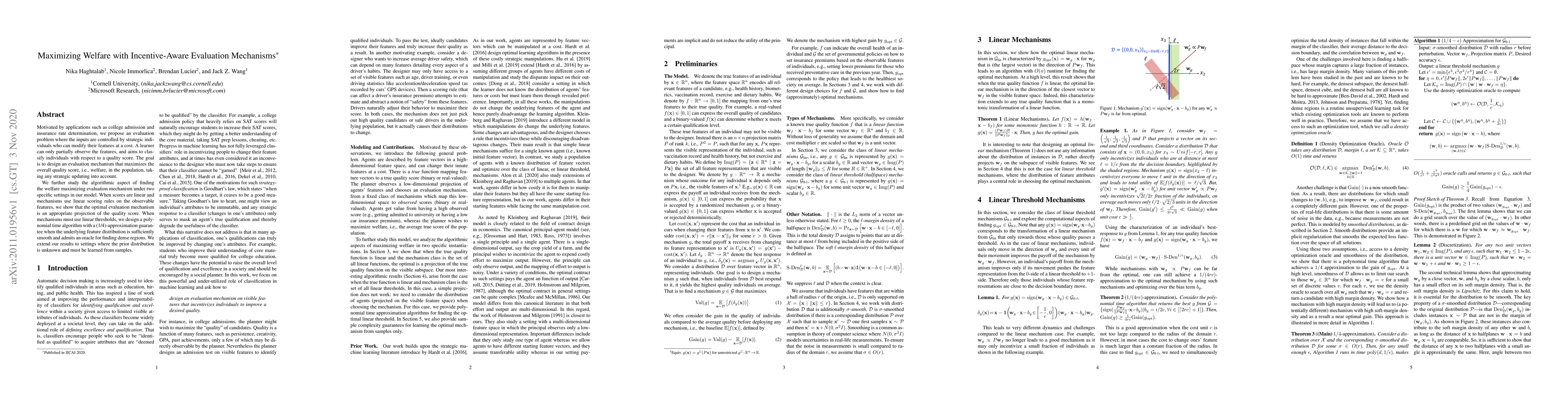 This paper proposes an evaluation mechanism to maximize welfare in strategic settings, such as college admissions and insurance, where individuals can alter their features at a cost. The authors develop algorithms for finding optimal evaluation mechanisms under linear and linear-threshold scoring rules, providing theoretical guarantees and extending results to unknown prior distributions.
