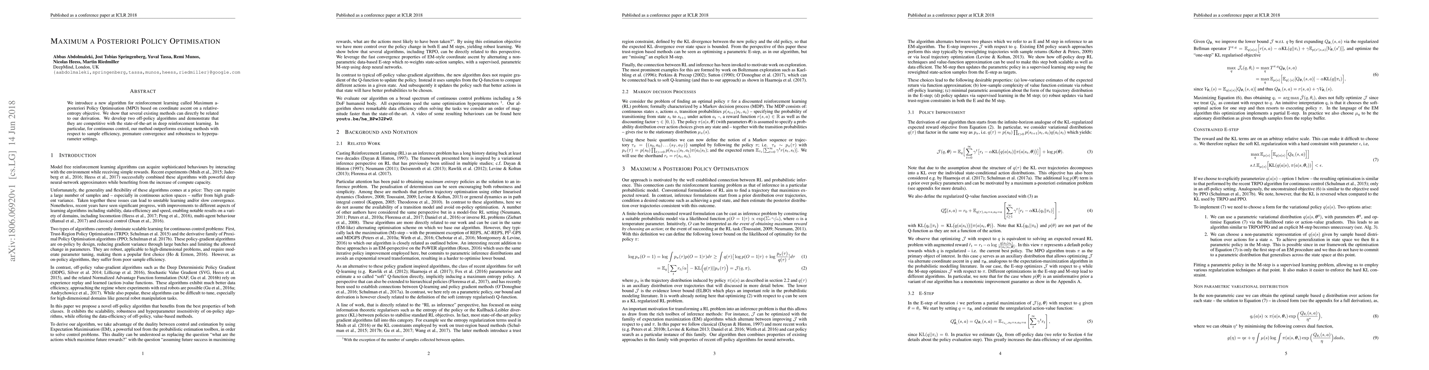 The paper introduces Maximum a Posteriori Policy Optimisation (MPO), an algorithm for reinforcement learning based on coordinate ascent on a relative entropy objective, demonstrating its competitiveness with state-of-the-art methods in deep reinforcement learning.