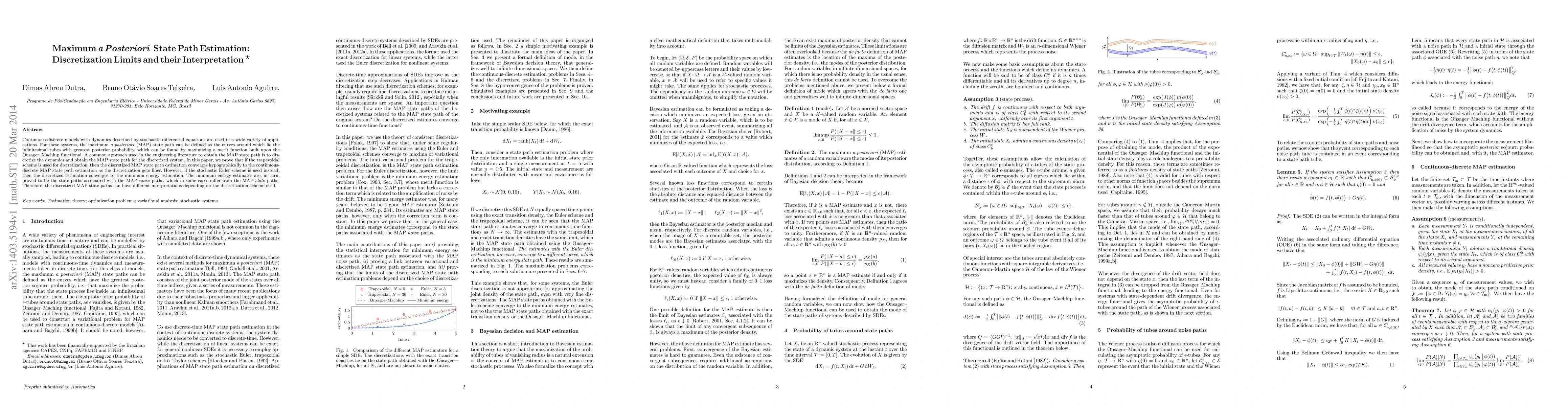 Continuous-discrete models with dynamics described by stochastic differential equations are used in a wide variety of applications. For these systems, the maximum a posteriori (MAP) state path can be defined as the curves around which lie the infinitesimal tubes with greatest posterior probability, which can be found by maximizing a merit function built upon the Onsager--Machlup functional. A common approach used in the engineering literature to obtain the MAP state path is to discretize the dynamics and obtain the MAP state path for the discretized system. In this paper, we prove that if the trapezoidal scheme is used for discretization, then the discretized MAP state path estimation converges hypographically to the continuous-discrete MAP state path estimation as the discretization gets finer. However, if the stochastic Euler scheme is used instead, then the discretized estimation converges to the minimum energy estimation. The minimum energy estimates are, in turn, proved to be the state paths associated with the MAP noise paths, which in some cases differ from the MAP state paths. Therefore, the discretized MAP state paths can have different interpretations depending on the discretization scheme used.