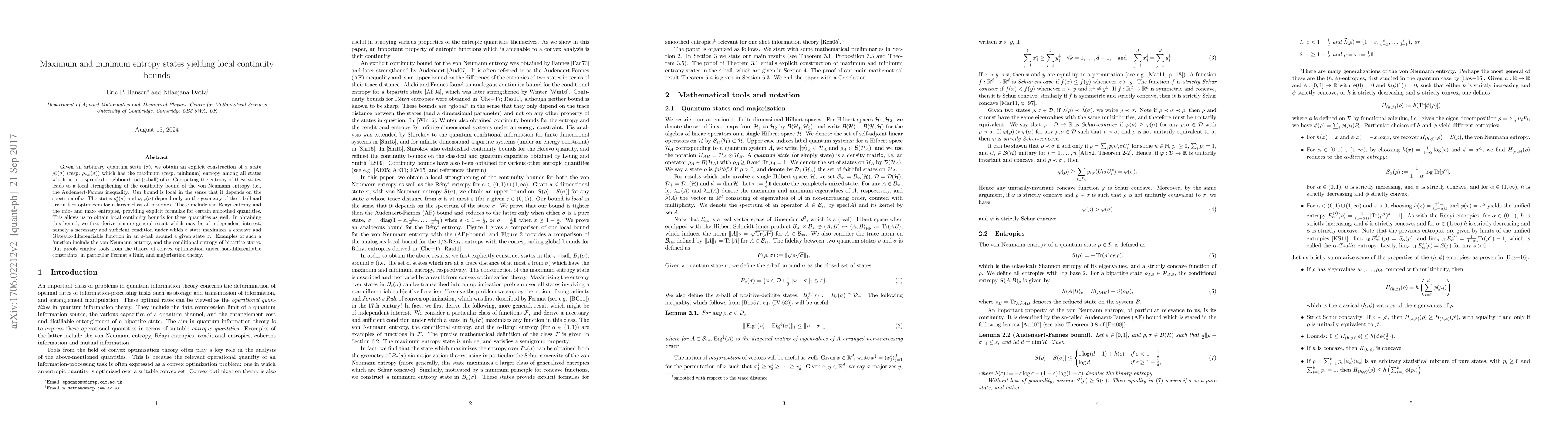 Given an arbitrary quantum state ($\sigma$), we obtain an explicit construction of a state $\rho^*_\varepsilon(\sigma)$ (resp. $\rho_{*,\varepsilon}(\sigma)$) which has the maximum (resp. minimum) entropy among all states which lie in a specified neighbourhood ($\varepsilon$-ball) of $\sigma$. Computing the entropy of these states leads to a local strengthening of the continuity bound of the von Neumann entropy, i.e., the Audenaert-Fannes inequality. Our bound is local in the sense that it depends on the spectrum of $\sigma$. The states $\rho^*_\varepsilon(\sigma)$ and $\rho_{*,\varepsilon}(\sigma)$ depend only on the geometry of the $\varepsilon$-ball and are in fact optimizers for a larger class of entropies. These include the R\'enyi entropy and the min- and max- entropies. This allows us to obtain local continuity bounds for these quantities as well. In obtaining this bound, we first derive a more general result which may be of independent interest, namely a necessary and sufficient condition under which a state maximizes a concave and G\^ateaux-differentiable function in an $\varepsilon$-ball around a given state $\sigma$. Examples of such a function include the von Neumann entropy, and the conditional entropy of bipartite states. Our proofs employ tools from the theory of convex optimization under non-differentiable constraints, in particular Fermat's Rule, and majorization theory.
