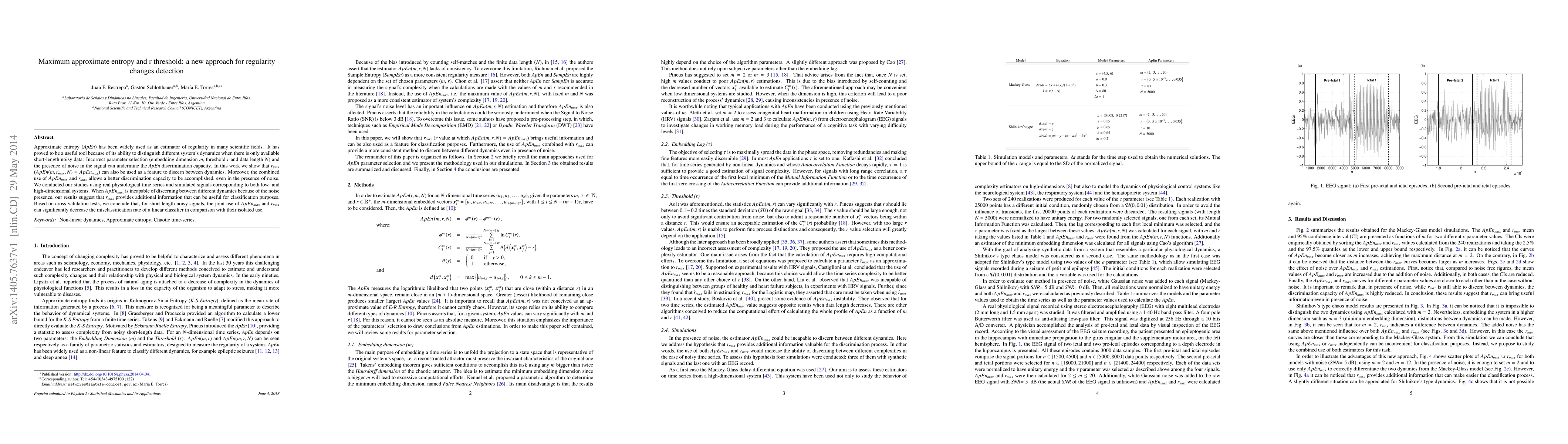 Approximate entropy (ApEn) has been widely used as an estimator of regularity in many scientific fields. It has proved to be a useful tool because of its ability to distinguish different system's dynamics when there is only available short-length noisy data. Incorrect parameter selection (embedding dimension $m$, threshold $r$ and data length $N$) and the presence of noise in the signal can undermine the ApEn discrimination capacity. In this work we show that $r_{max}$ ($ApEn(m,r_{max},N)=ApEn_{max}$) can also be used as a feature to discern between dynamics. Moreover, the combined use of $ApEn_{max}$ and $r_{max}$ allows a better discrimination capacity to be accomplished, even in the presence of noise. We conducted our studies using real physiological time series and simulated signals corresponding to both low- and high-dimensional systems. When $ApEn_{max}$ is incapable of discerning between different dynamics because of the noise presence, our results suggest that $r_{max}$ provides additional information that can be useful for classification purposes. Based on cross-validation tests, we conclude that, for short length noisy signals, the joint use of $ApEn_{max}$ and $r_{max}$ can significantly decrease the misclassification rate of a linear classifier in comparison with their isolated use.