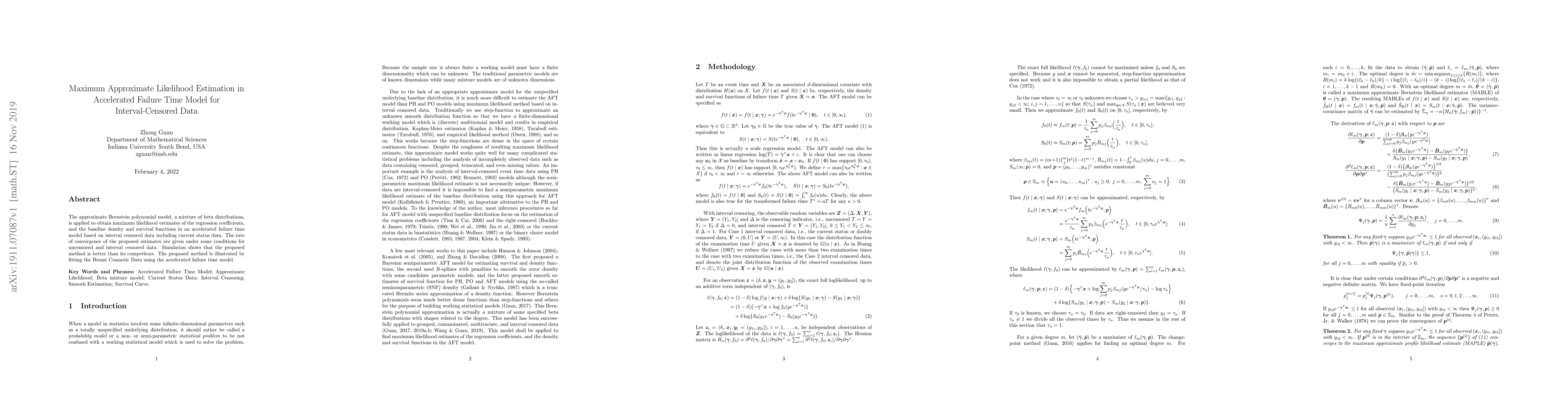 This paper proposes an approximate Bernstein polynomial model to estimate regression coefficients and survival functions in accelerated failure time models for interval-censored data, demonstrating superior performance through simulations and application to Breast Cosmetic Data. The method's convergence rate is analyzed under certain conditions.