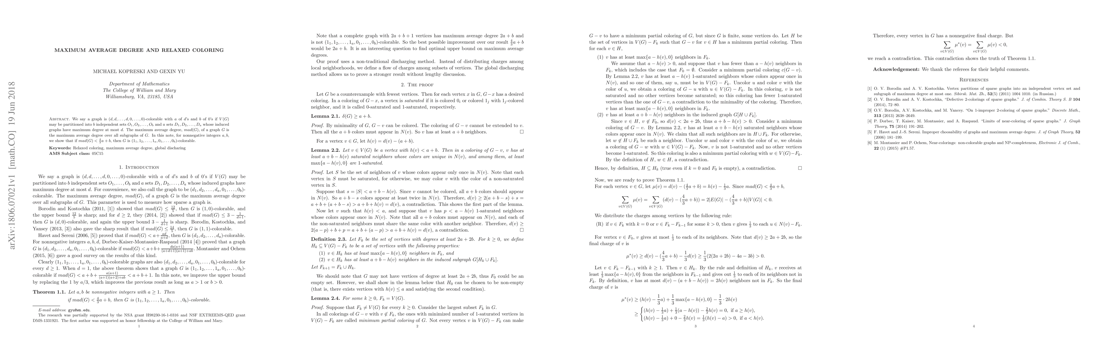 This paper investigates graph coloring under the condition of maximum average degree, proving that if the maximum average degree of a graph $G$ is less than $\frac{4}{3}a + b$, then $G$ can be $(1_1, 1_2, \ldots, 1_a, 0_1, \ldots, 0_b)$-colored. This establishes a relationship between graph coloring and the structural properties of subgraphs.