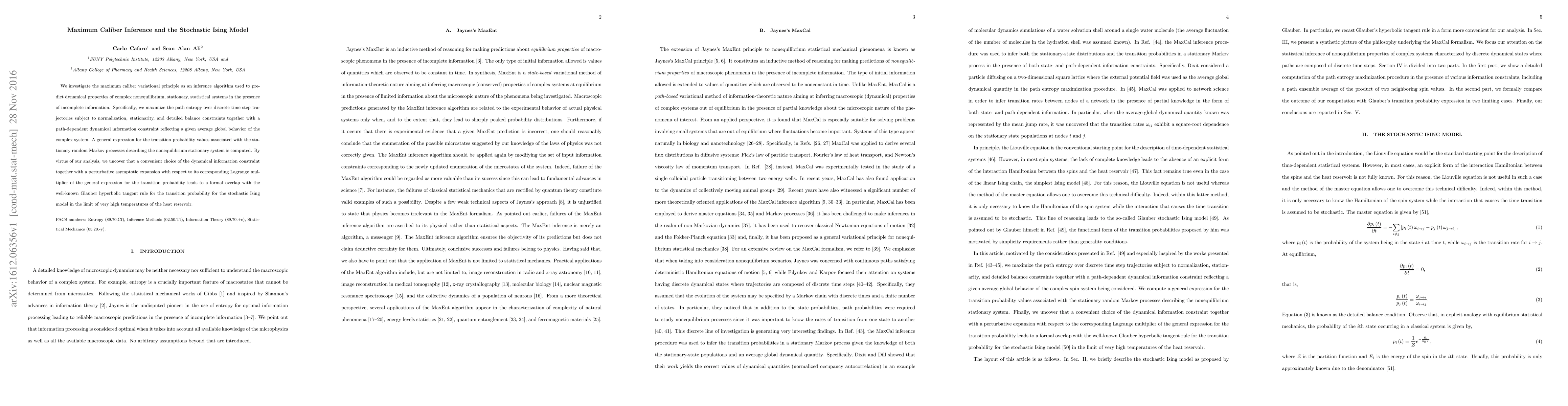 We investigate the maximum caliber variational principle as an inference algorithm used to predict dynamical properties of complex nonequilibrium, stationary, statistical systems in the presence of incomplete information. Specifically, we maximize the path entropy over discrete time step trajectories subject to normalization, stationarity, and detailed balance constraints together with a path-dependent dynamical information constraint reflecting a given average global behavior of the complex system. A general expression for the transition probability values associated with the stationary random Markov processes describing the nonequilibrium stationary system is computed. By virtue of our analysis, we uncover that a convenient choice of the dynamical information constraint together with a perturbative asymptotic expansion with respect to its corresponding Lagrange multiplier of the general expression for the transition probability leads to a formal overlap with the well-known Glauber hyperbolic tangent rule for the transition probability for the stochastic Ising model in the limit of very high temperatures of the heat reservoir.