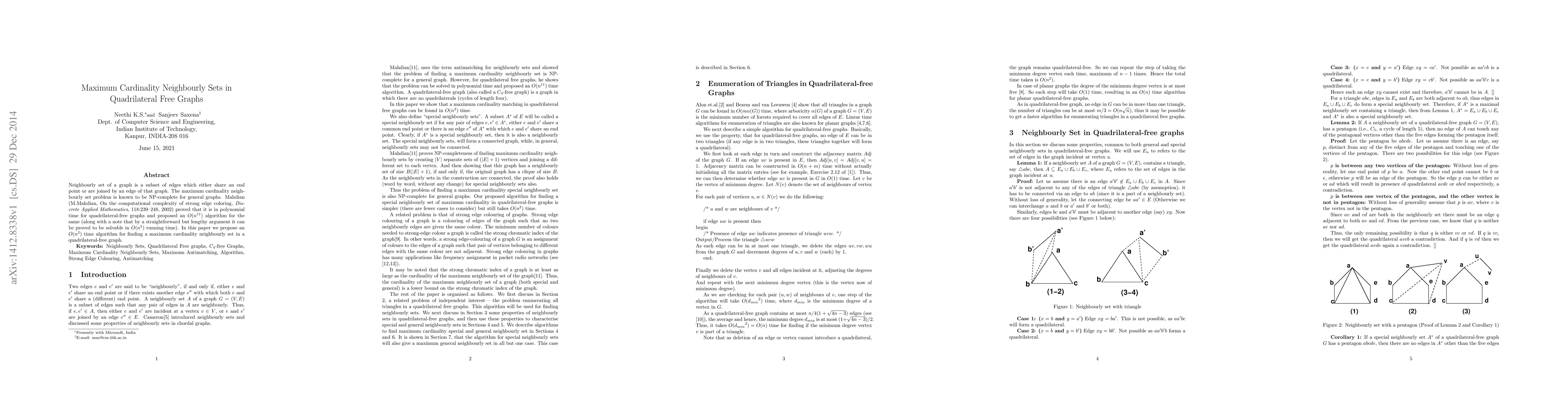 Neighbourly set of a graph is a subset of edges which either share an end point or are joined by an edge of that graph. The maximum cardinality neighbourly set problem is known to be NP-complete for general graphs. Mahdian (M.Mahdian, On the computational complexity of strong edge coloring, Discrete Applied Mathematics, 118:239-248, 2002) proved that it is in polynomial time for quadrilateral-free graphs and proposed an O(n^{11}) algorithm for the same (along with a note that by a straightforward but lengthy argument it can be proved to be solvable in O(n^5) running time). In this paper we propose an O(n^2) time algorithm for finding a maximum cardinality neighbourly set in a quadrilateral-free graph.