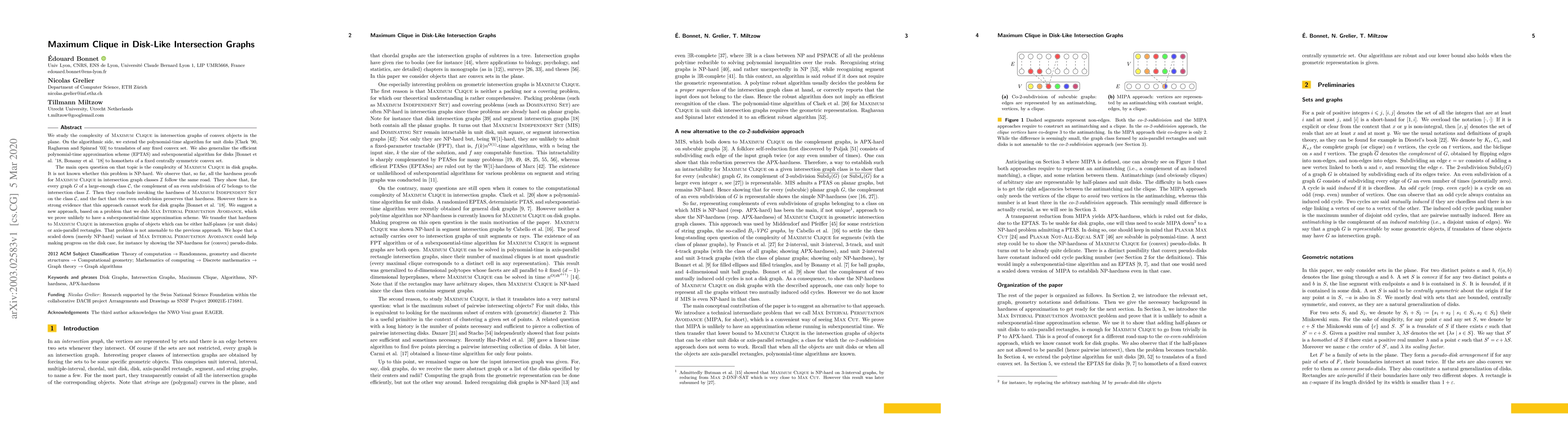 This paper extends polynomial-time algorithms for Maximum Clique in intersection graphs of convex objects, including generalizing results for disks to any fixed convex set. It proposes a new approach to tackle the open question of Maximum Clique's complexity in disk graphs, suggesting a problem called Max Interval Permutation Avoidance as a potential hardness route for related intersection graph problems.