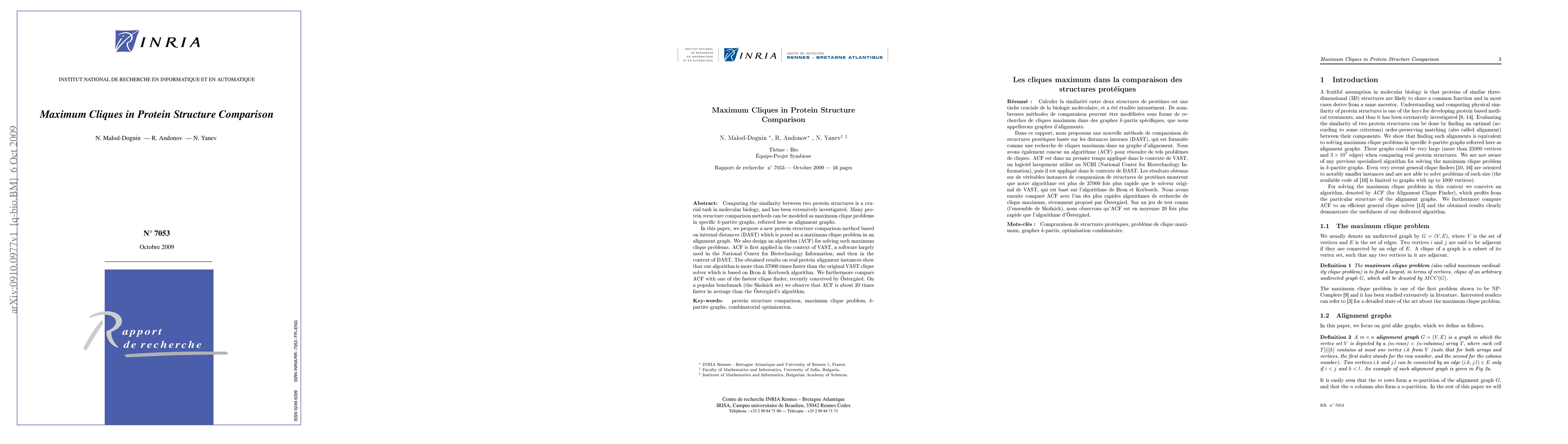 This paper introduces a new protein structure comparison method (DAST) modeled as a maximum clique problem in alignment graphs and proposes an algorithm (ACF) to solve these problems. The ACF algorithm is significantly faster than existing methods, showing over 37,000 times improvement over the original VAST solver and about 20 times faster than a recent fast clique finder on benchmark data.