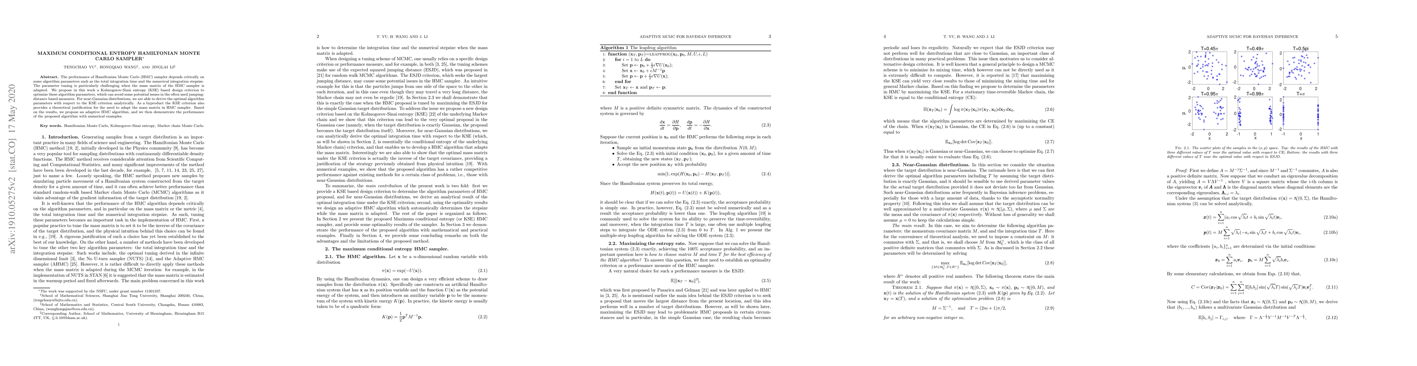 The performance of Hamiltonian Monte Carlo (HMC) sampler depends critically on some algorithm parameters such as the total integration time and the numerical integration stepsize. The parameter tuning is particularly challenging when the mass matrix of the HMC sampler is adapted. We propose in this work a Kolmogorov-Sinai entropy (KSE) based design criterion to optimize these algorithm parameters, which can avoid some potential issues in the often used jumping-distance based measures. For near-Gaussian distributions, we are able to derive the optimal algorithm parameters with respect to the KSE criterion analytically. As a byproduct the KSE criterion also provides a theoretical justification for the need to adapt the mass matrix in HMC sampler. Based on the results, we propose an adaptive HMC algorithm, and we then demonstrate the performance of the proposed algorithm with numerical examples.