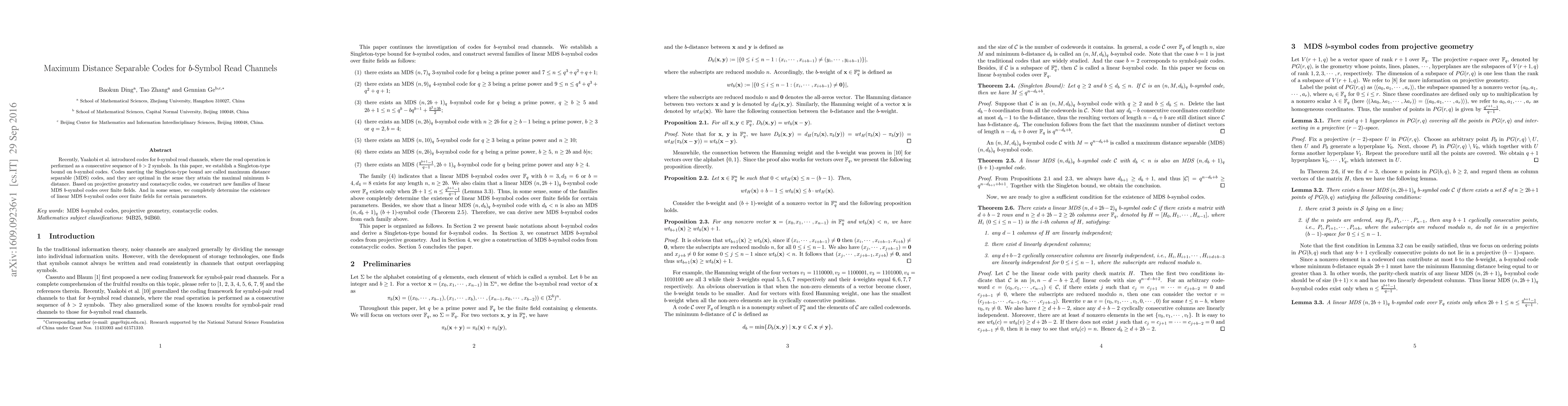 This paper establishes a Singleton-type bound for $b$-symbol read channels and constructs new families of linear maximum distance separable (MDS) codes over finite fields using projective geometry and constacyclic codes, fully determining the existence of such codes for specific parameters.