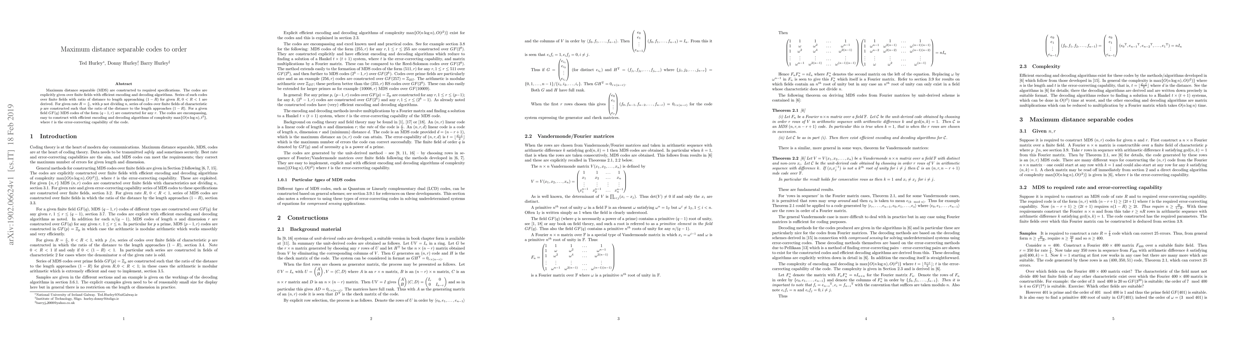 Maximum distance separable (MDS) are constructed to required specifications. The codes are explicitly given over finite fields with efficient encoding and decoding algorithms. Series of such codes over finite fields with ratio of distance to length approaching $(1-R)$ for given $R, \, 0 < R < 1$ are derived. For given rate $R=\frac{r}{n}$, with $p$ not dividing $n$, series of codes over finite fields of characteristic $p$ are constructed such that the ratio of the distance to the length approaches $(1-R)$. For a given field $GF(q)$ MDS codes of the form $(q-1,r)$ are constructed for any $r$. The codes are encompassing, easy to construct with efficient encoding and decoding algorithms of complexity $\max\{O(n\log n), t^2\}$, where $t$ is the error-correcting capability of the code.