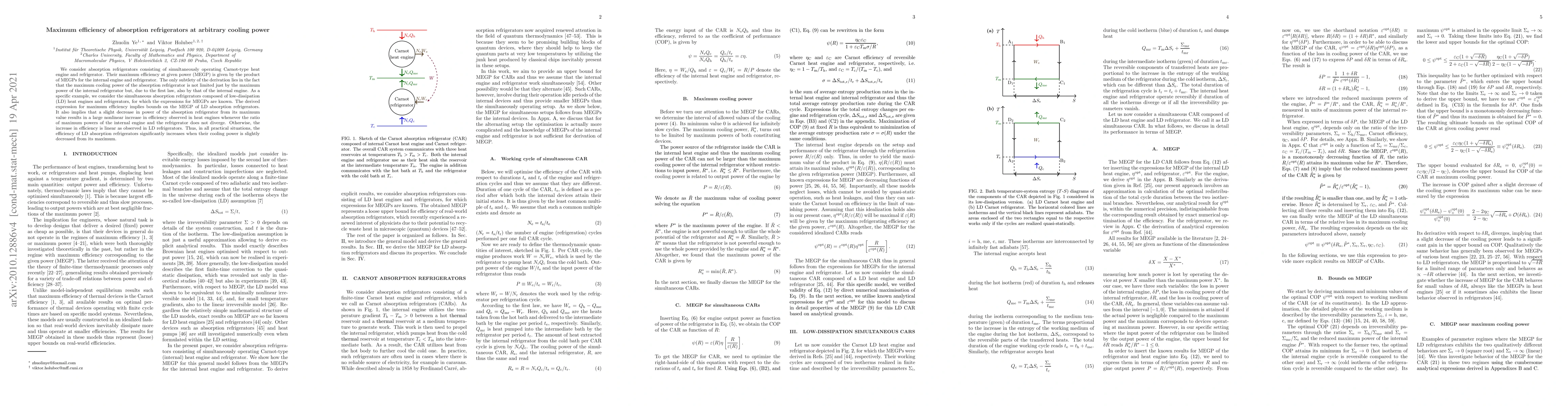 This paper investigates the maximum efficiency of absorption refrigerators, showing that their efficiency is determined by the product of the internal engine and refrigerator's maximum efficiency at given power (MEGP). It finds that a slight decrease in cooling power leads to a significant nonlinear increase in efficiency, especially for low-dissipation systems.