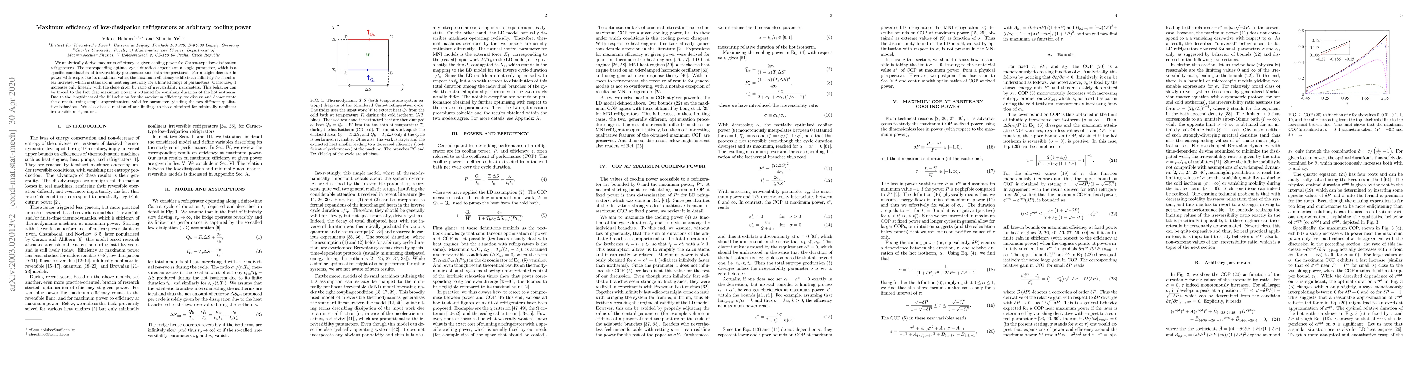 This paper analytically derives maximum efficiency for Carnot-type low-dissipation refrigerators, showing that efficiency increases nonlinearly only within a limited range of parameters. Outside this range, efficiency increases linearly with a slope determined by irreversibility parameters.