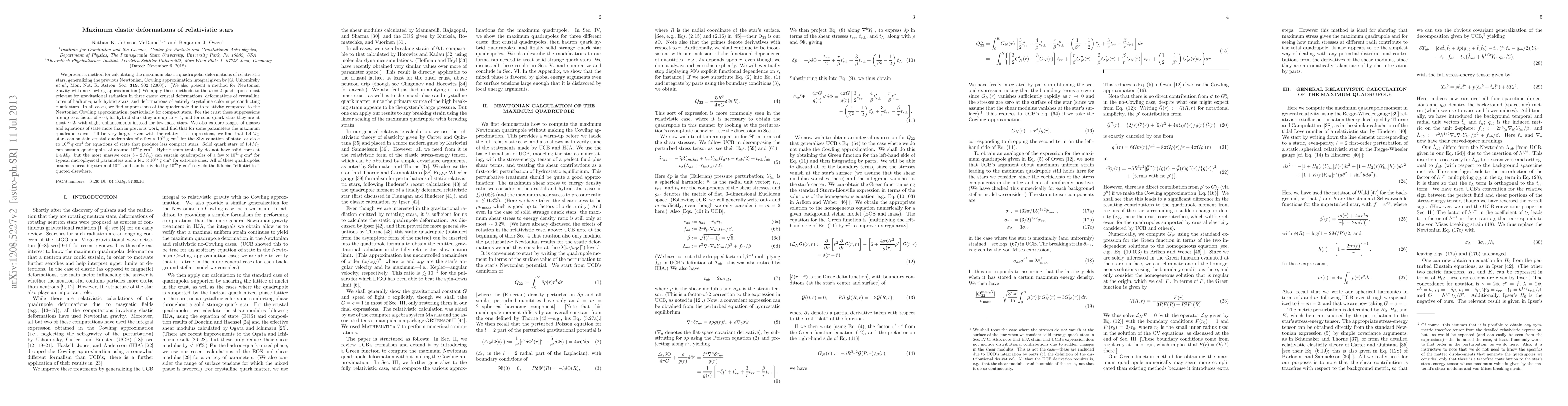 We present a method for calculating the maximum elastic quadrupolar deformations of relativistic stars, generalizing the previous Newtonian, Cowling approximation integral given by [G. Ushomirsky et al., Mon. Not. R. Astron. Soc. 319, 902 (2000)]. (We also present a method for Newtonian gravity with no Cowling approximation.) We apply these methods to the m = 2 quadrupoles most relevant for gravitational radiation in three cases: crustal deformations, deformations of crystalline cores of hadron-quark hybrid stars, and deformations of entirely crystalline color superconducting quark stars. In all cases, we find suppressions of the quadrupole due to relativity compared to the Newtonian Cowling approximation, particularly for compact stars. For the crust these suppressions are up to a factor ~6, for hybrid stars they are up to ~4, and for solid quark stars they are at most ~2, with slight enhancements instead for low mass stars. We also explore ranges of masses and equations of state more than in previous work, and find that for some parameters the maximum quadrupoles can still be very large. Even with the relativistic suppressions, we find that 1.4 solar mass stars can sustain crustal quadrupoles of a few times 10^39 g cm^2 for the SLy equation of state or close to 10^40 g cm^2 for equations of state that produce less compact stars. Solid quark stars of 1.4 solar masses can sustain quadrupoles of around 10^44 g cm^2. Hybrid stars typically do not have solid cores at 1.4 solar masses, but the most massive ones (~2 solar masses) can sustain quadrupoles of a few times 10^41 g cm^2 for typical microphysical parameters and a few times 10^42 g cm^2 for extreme ones. All of these quadrupoles assume a breaking strain of 0.1 and can be divided by 10^45 g cm^2 to yield the fiducial "ellipticities" quoted elsewhere.