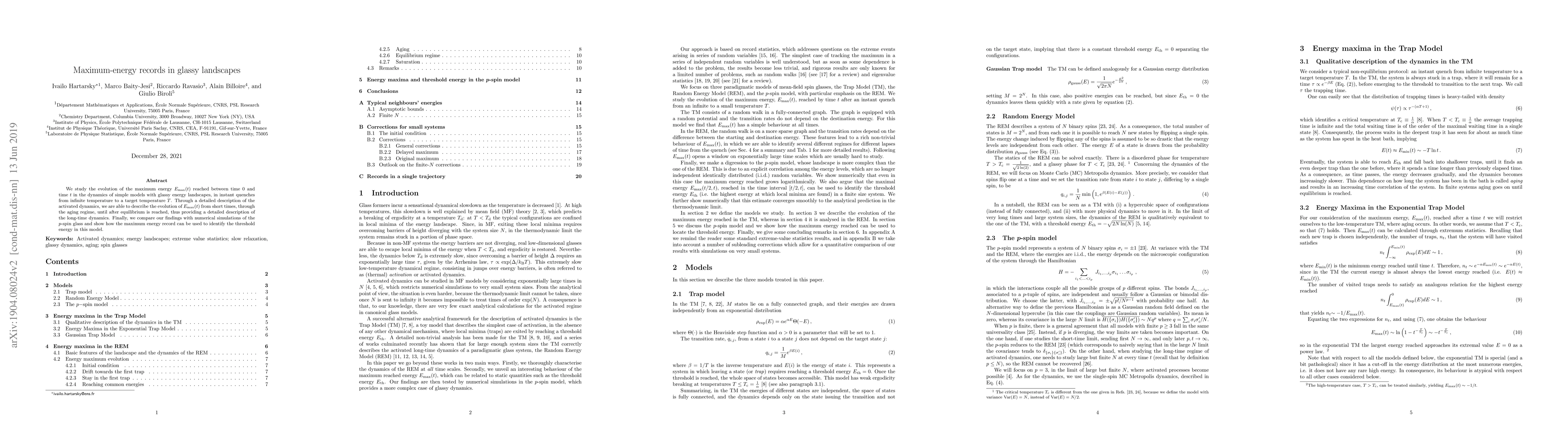 We study the evolution of the maximum energy $E_\max(t)$ reached between time $0$ and time $t$ in the dynamics of simple models with glassy energy landscapes, in instant quenches from infinite temperature to a target temperature $T$. Through a detailed description of the activated dynamics, we are able to describe the evolution of $E_\max(t)$ from short times, through the aging regime, until after equilibrium is reached, thus providing a detailed description of the long-time dynamics. Finally, we compare our findings with numerical simulations of the $p$-spin glass and show how the maximum energy record can be used to identify the threshold energy in this model.