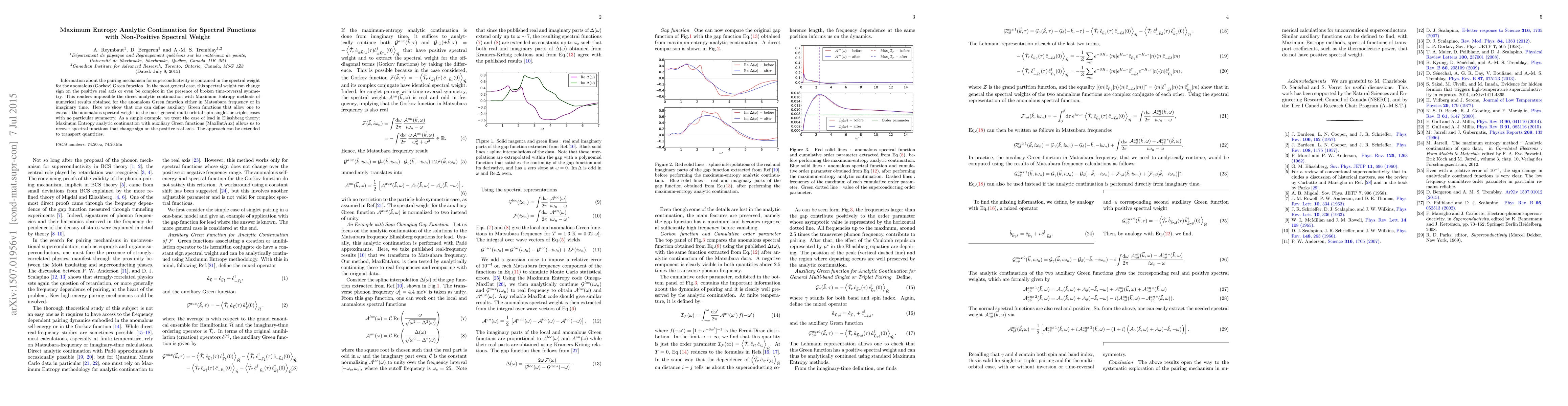 Information about the pairing mechanism for superconductivity is contained in the spectral weight for the anomalous (Gorkov) Green function. In the most general case, this spectral weight can change sign on the positive real axis or even be complex in the presence of broken time-reversal symmetry. This renders impossible the direct analytic continuation with Maximum Entropy methods of numerical results obtained for the anomalous Green function either in Matsubara frequency or in imaginary time. Here we show that one can define auxiliary Green functions that allow one to extract the anomalous spectral weight in the most general multi-orbital spin-singlet or triplet cases with no particular symmetry. As a simple example, we treat the case of lead in Eliashberg theory: Maximum Entropy analytic continuation with auxiliary Green functions (MaxEntAux) allows us to recover spectral functions that change sign on the positive real axis. The approach can be extended to transport quantities.
