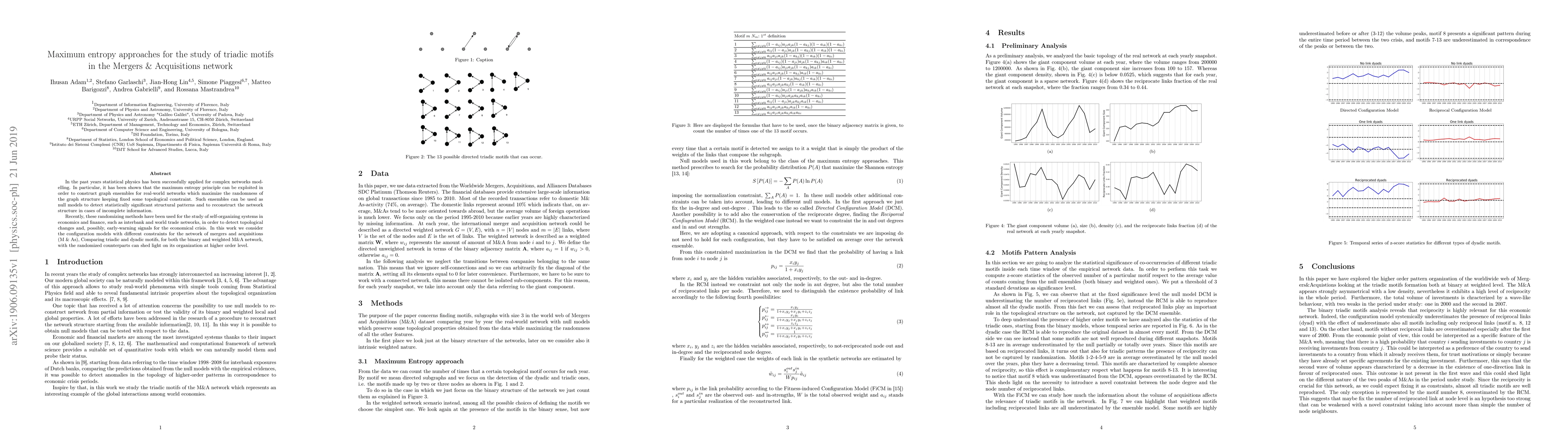 This paper applies maximum entropy principles to construct graph ensembles for modeling mergers and acquisitions (M&A) networks, using these ensembles to detect significant structural patterns and higher-order motifs compared to randomized counterparts. The study aims to uncover organizational insights at a triadic level within the M&A network.