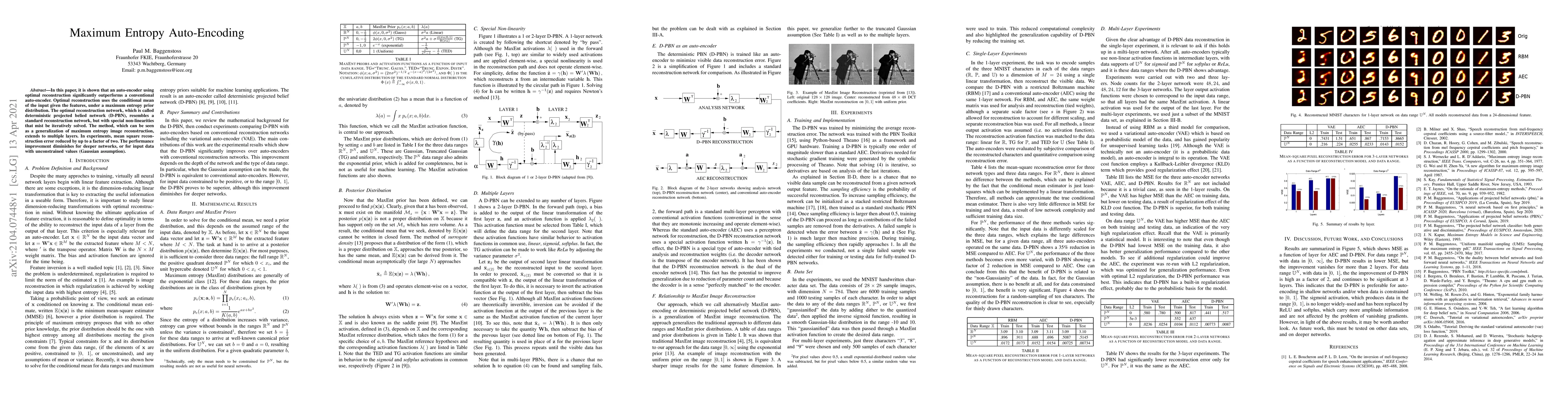 The paper introduces Deterministic Projected Belief Network (D-PBN), an auto-encoder that uses optimal reconstruction with maximum entropy prior, outperforming conventional auto-encoders by reducing mean square error by up to half. This improvement diminishes in deeper networks or with unconstrained input data.
