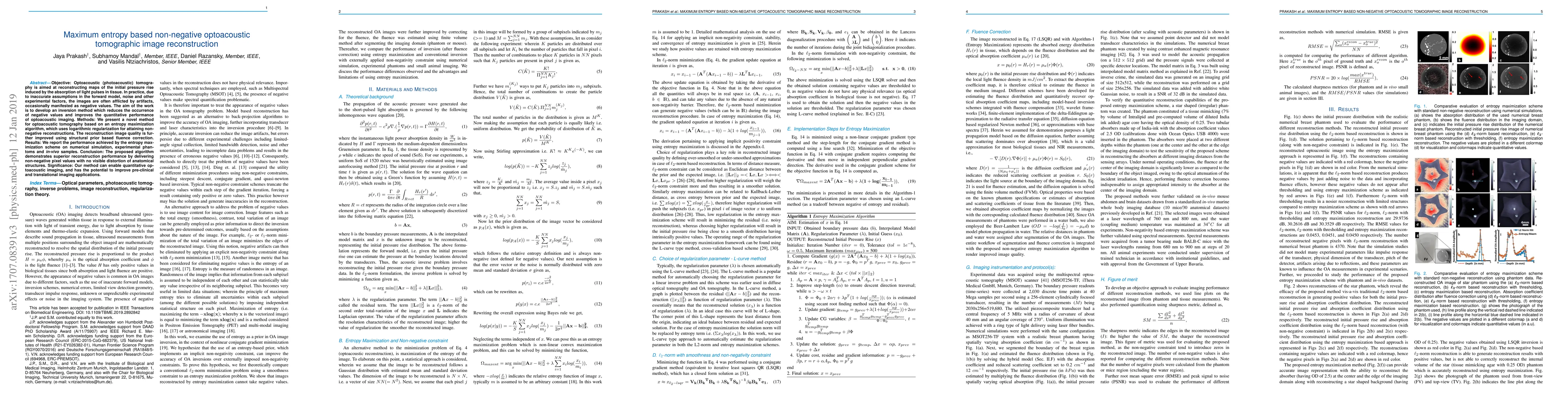 Objective:Optoacoustic (photoacoustic) tomography is aimed at reconstructing maps of the initial pressure rise induced by the absorption of light pulses in tissue. In practice, due to inaccurate assumptions in the forward model, noise and other experimental factors, the images are often afflicted by artifacts, occasionally manifested as negative values. The aim of the work is to develop an inversion method which reduces the occurrence of negative values and improves the quantitative performance of optoacoustic imaging. Methods: We present a novel method for optoacoustic tomography based on an entropy maximization algorithm, which uses logarithmic regularization for attaining non-negative reconstructions. The reconstruction image quality is further improved using structural prior based fluence correction. Results: We report the performance achieved by the entropy maximization scheme on numerical simulation, experimental phantoms and in-vivo samples. Conclusion: The proposed algorithm demonstrates superior reconstruction performance by delivering non-negative pixel values with no visible distortion of anatomical structures. Significance: Our method can enable quantitative optoacoustic imaging, and has the potential to improve pre-clinical and translational imaging applications.