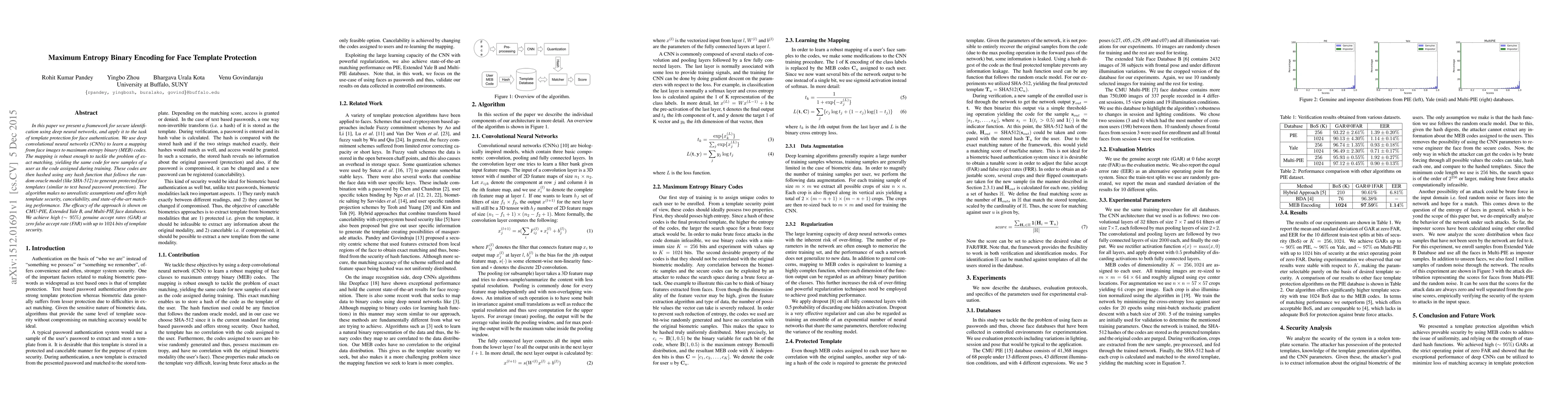 This paper proposes a secure face authentication method using deep convolutional neural networks to generate maximum entropy binary codes, which are then hashed for template protection, achieving high security and cancelability with state-of-the-art matching performance. The method demonstrates high genuine acceptance rates at zero false acceptance rates on multiple face databases.