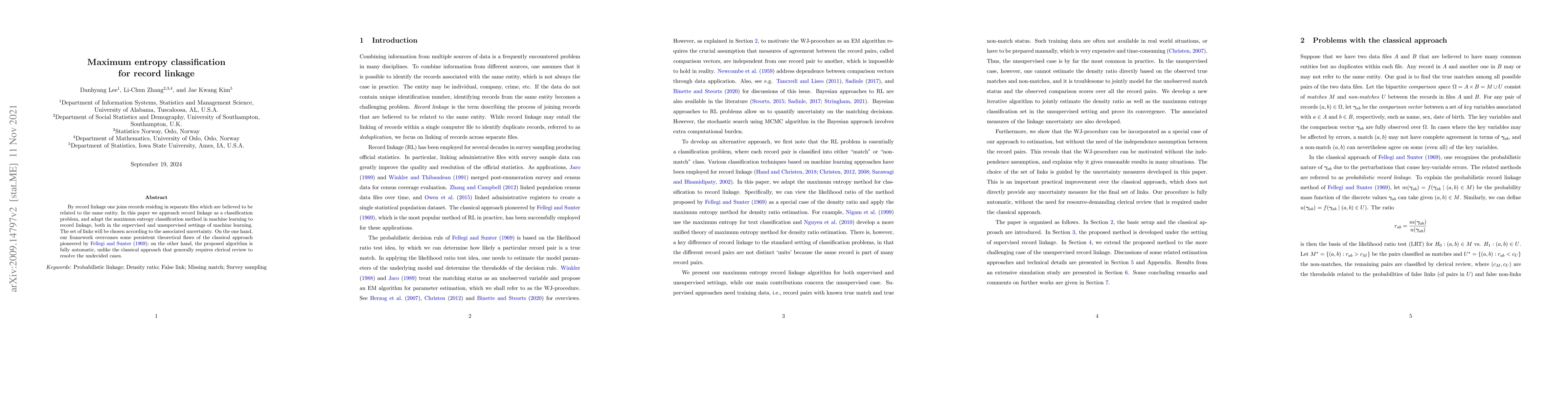 This paper proposes using maximum entropy classification for record linkage, adapting it for both supervised and unsupervised settings. The method addresses theoretical flaws of the classical Fellegi and Sunter approach, offering a scalable and fully automatic solution without the need for clerical review.