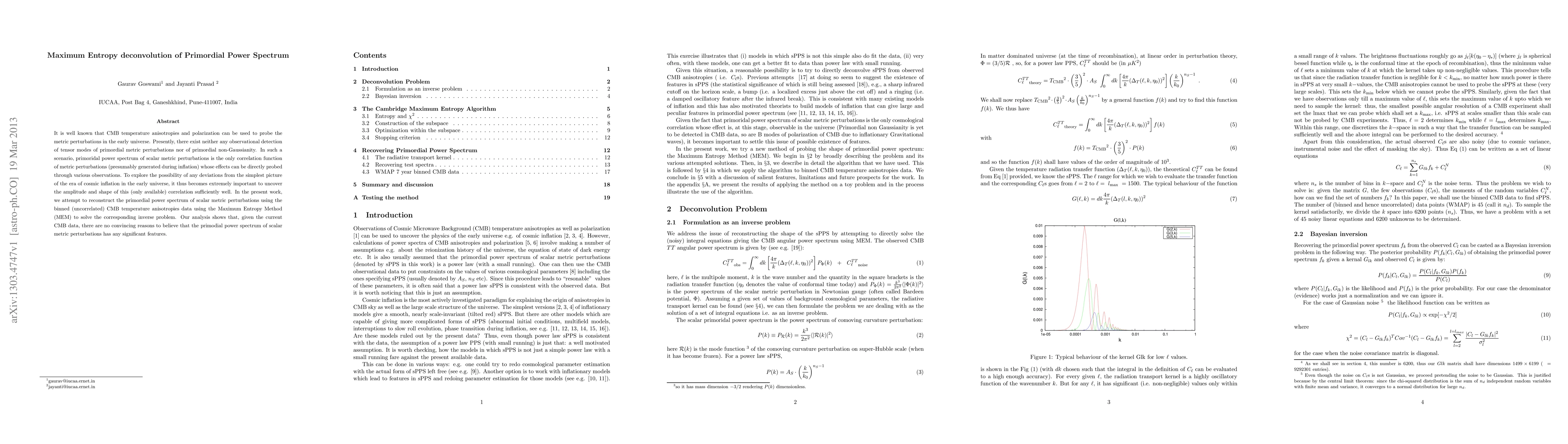 This paper uses the Maximum Entropy Method (MEM) to reconstruct the primordial power spectrum from CMB temperature anisotropies, finding no significant deviations from the simplest inflationary model. The analysis suggests no compelling evidence for features in the primordial power spectrum of scalar metric perturbations.